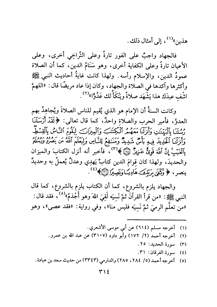 والجهاد يلزم بالشروع، كما أن الكتاب يلزم بالشروع، كما قال النبي - صَلَّى اللَّهُ عَلَيْهِ وَسَلَّمَ -: "من قرأ القرآن ثمَّ نَسِيَه لَقِيَ الله وهو أَجْذمُ" (¬٥)، فقد قال: "من تعلَّم الرميَ ثمَّ نَسِيَه فليس منا"، وفي رواية: "فقد عصى"، وهو