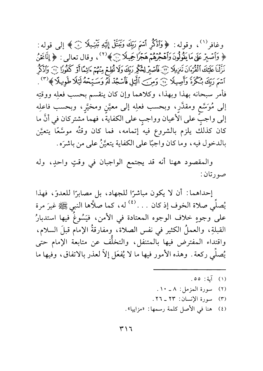 وغافر (¬١)، وقوله: (وَاذْكُرِ اسْمَ رَبِّكَ وَتَبَتَّلْ إِلَيْهِ تَبْتِيلًا (٨)) إلى قوله: (وَاصْبِرْ عَلَى مَا يَقُولُونَ وَاهْجُرْهُمْ هَجْرًا جَمِيلًا (١٠)) (¬٢)، وقال تعالى: (إِنَّا نَحْنُ نَزَّلْنَا عَلَيْكَ الْقُرْآَنَ تَنْزِيلًا (٢٣) فَاصْبِرْ لِحُكْمِ رَبِّكَ وَلَا تُطِعْ مِنْهُمْ آَثِمًا أَوْ كَفُورًا (٢٤) وَاذْكُرِ اسْمَ رَبِّكَ بُكْرَةً وَأَصِيلًا (٢٥) وَمِنَ اللَّيْلِ فَاسْجُدْ لَهُ وَسَبِّحْهُ لَيْلًا طَوِيلًا) (¬٣).
