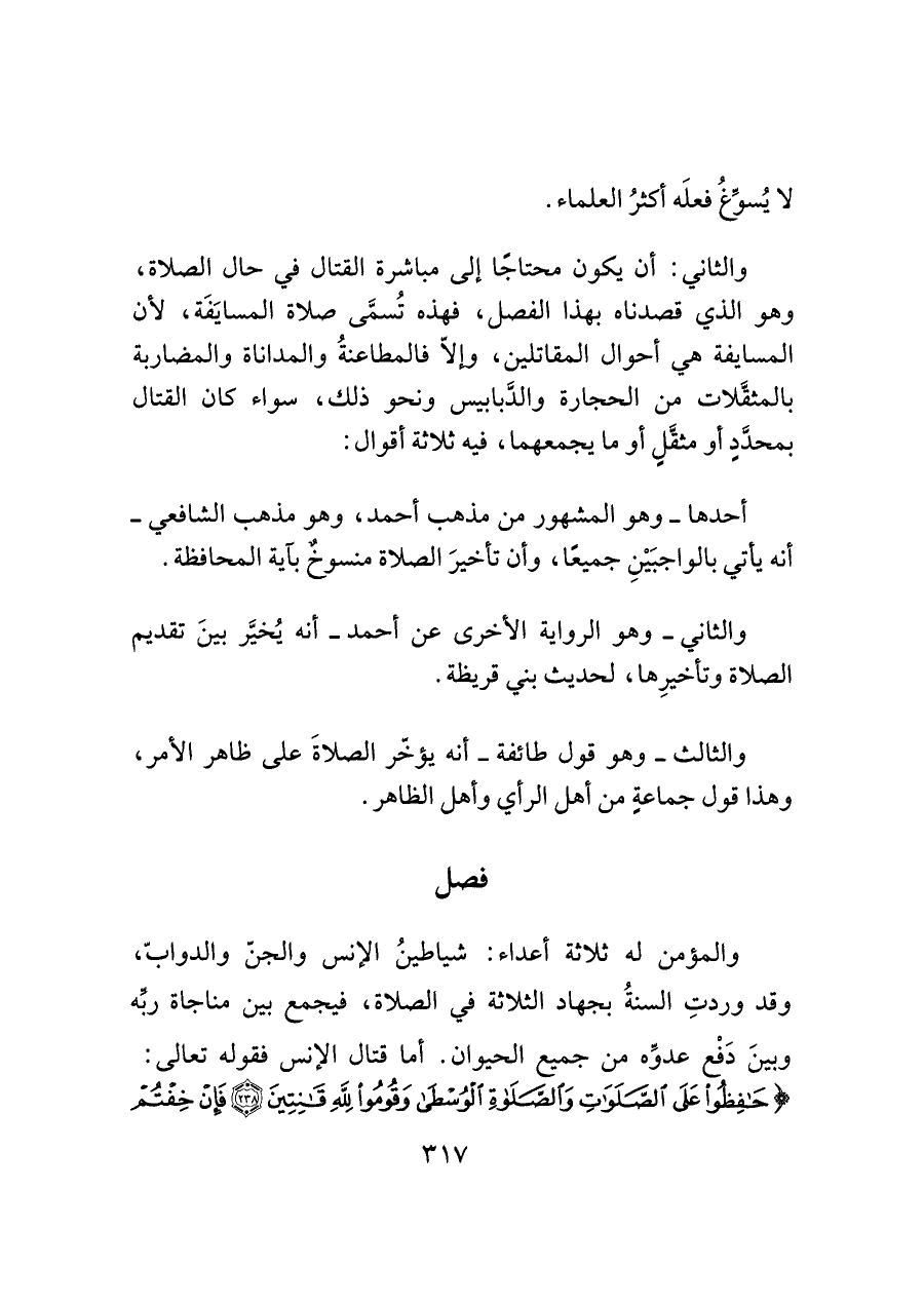 والمؤمن له ثلاثة أعداء: شياطينُ الإنس والجنّ والدوابّ، وقد وردتِ السنةُ بجهاد الثلاثة في الصلاة، فيجمع بين مناجاة ربه وبينَ دَفْع عدوه من جميع الحيوان. أما قتال الإنس فقوله تعالى: (حَافِظُوا عَلَى الصَّلَوَاتِ وَالصَّلَاةِ الْوُسْطَى وَقُومُوا لِلَّهِ قَانِتِينَ (٢٣٨) فَإِنْ خِفْتُمْ