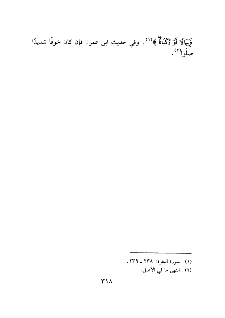 فَرِجَالًا أَوْ رُكْبَانًا) (¬١). وفي حديث ابن عمر: فإن كان خوفا شديدا صلّوا (¬٢).