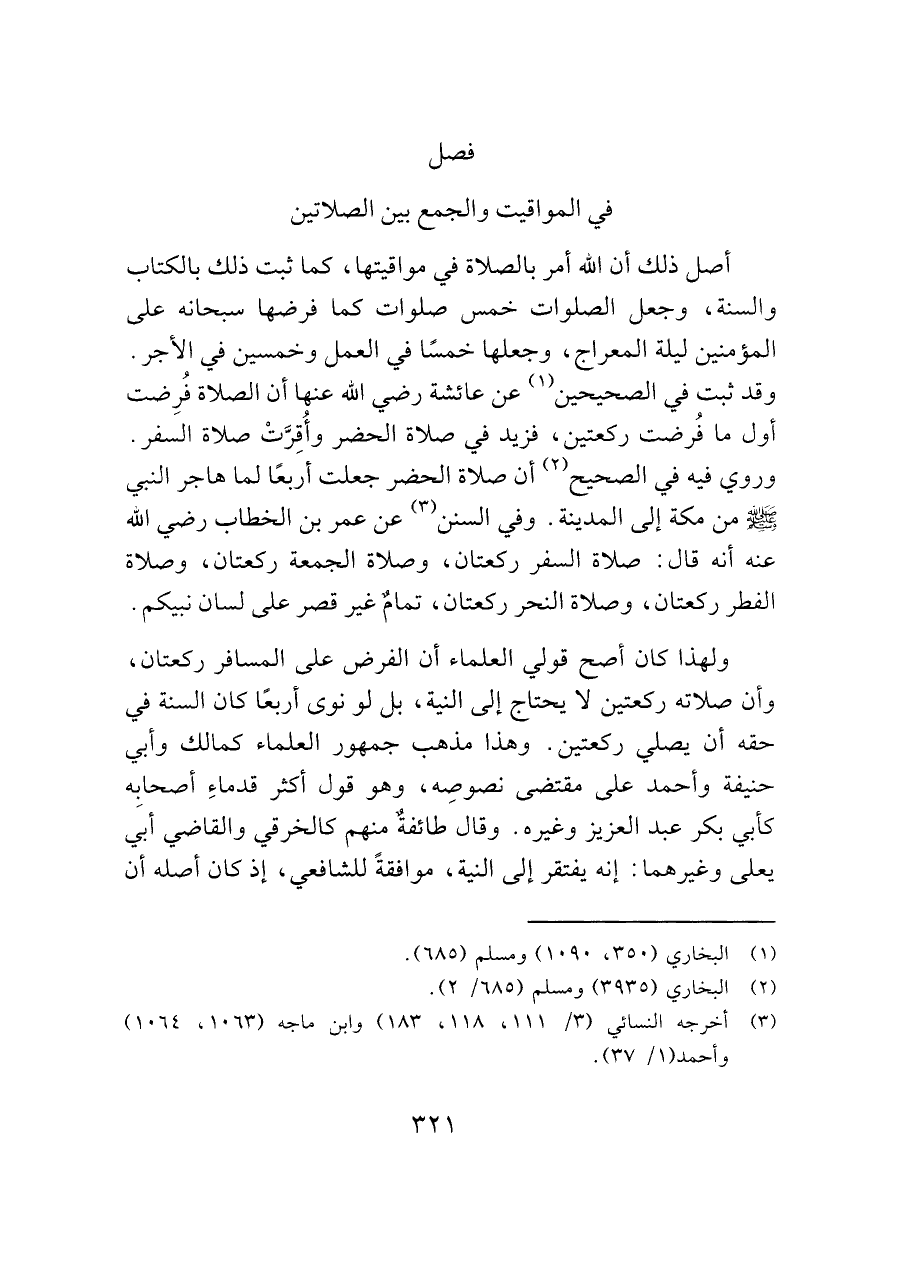 ولهذا كان أصح قولي العلماء أن الفرض على المسافر ركعتان، وأن صلاته ركعتين لا يحتاج إلى النية، بل لو نوى أربعًا كان السنة في حقه أن يصلي ركعتين. وهذا مذهب جمهور العلماء كمالك وأبي حنيفة وأحمد على مقتضى نصوصِه، وهو قول أكثر قدماءِ أصحابه كأبي بكر عبد العزيز وغيره. وقال طائفةٌ منهم كالخرقي والقاضي أبي يعلى وغيرهما: إنه يفتقر إلى النية، موافقةً للشافعي، إذ كان أصله أن