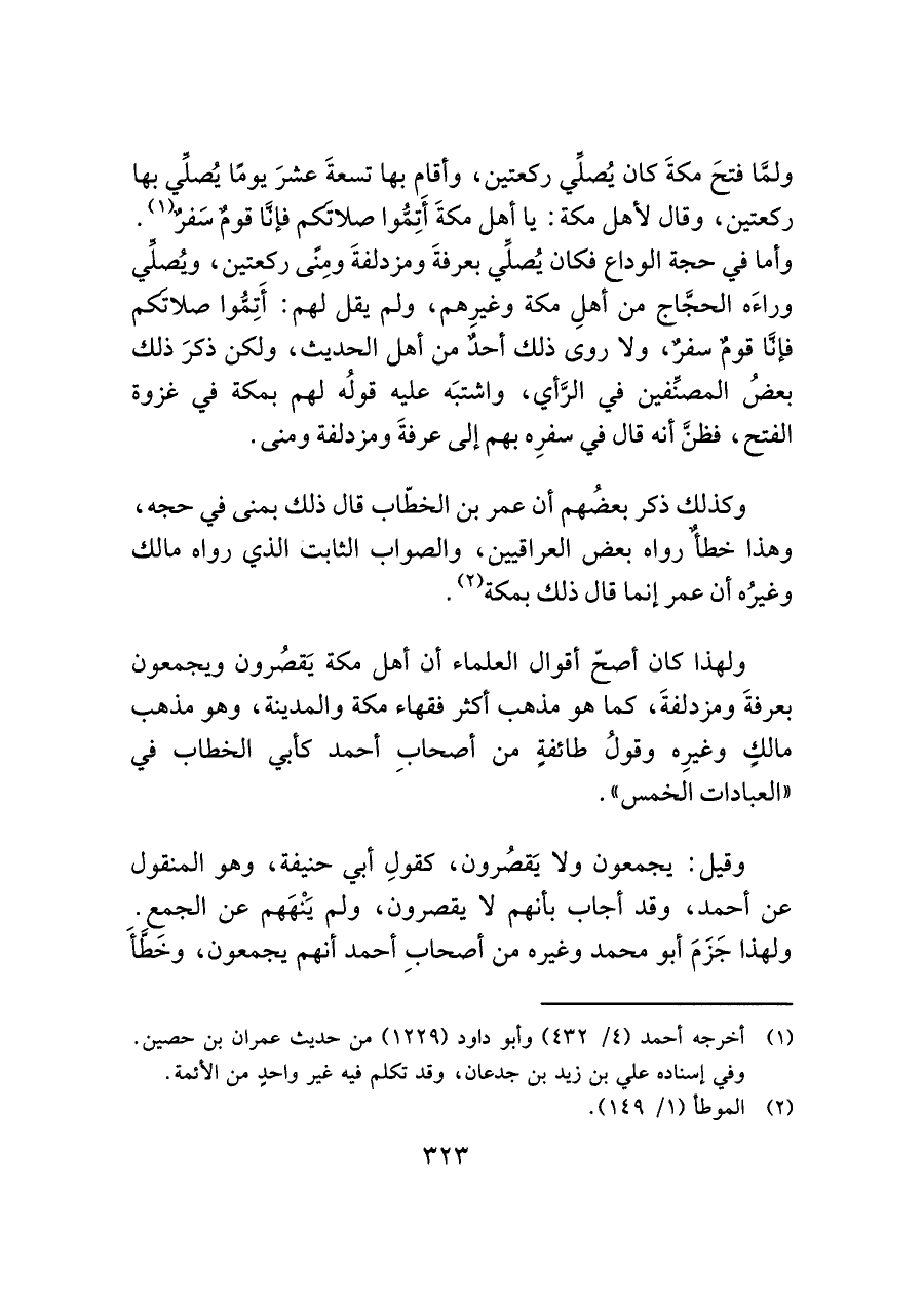 ولهذا كان أصحّ أقوال العلماء أن أهل مكة يَقصُرون ويجمعون بعرفةَ ومزدلفةَ، كما هو مذهب أكثر فقهاء مكة والمدينة، وهو مذهب مالكٍ وغيرِه وقولُ طائفةٍ من أصحابِ أحمد كأبي الخطاب في "العبادات الخمس".