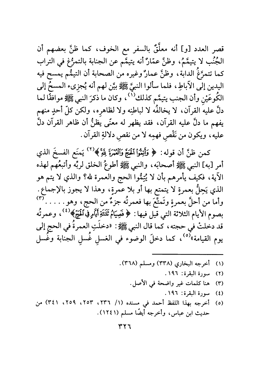 كمن ظنَّ أن قوله: (وَأَتِمُّوا الْحَجَّ وَالْعُمْرَةَ لِلَّهِ) (¬٢) يَمنَع الفسخَ الذي أمر [به] النبي - صَلَّى اللَّهُ عَلَيْهِ وَسَلَّمَ - أصحابَه، والنبي - صَلَّى اللَّهُ عَلَيْهِ وَسَلَّمَ - أطوعُ الخلق لربِّه وأتبعُهم لهذه الآية، فكيف يأمرهم بأن لا يتمُّوا الحج والعمرة لله؟ والذي لا يتم هو الذي يَحِلُّ بعمرةٍ لا يتمتع بها أو بلا عمرةٍ، وهذا لا يجوز بالإجماع.