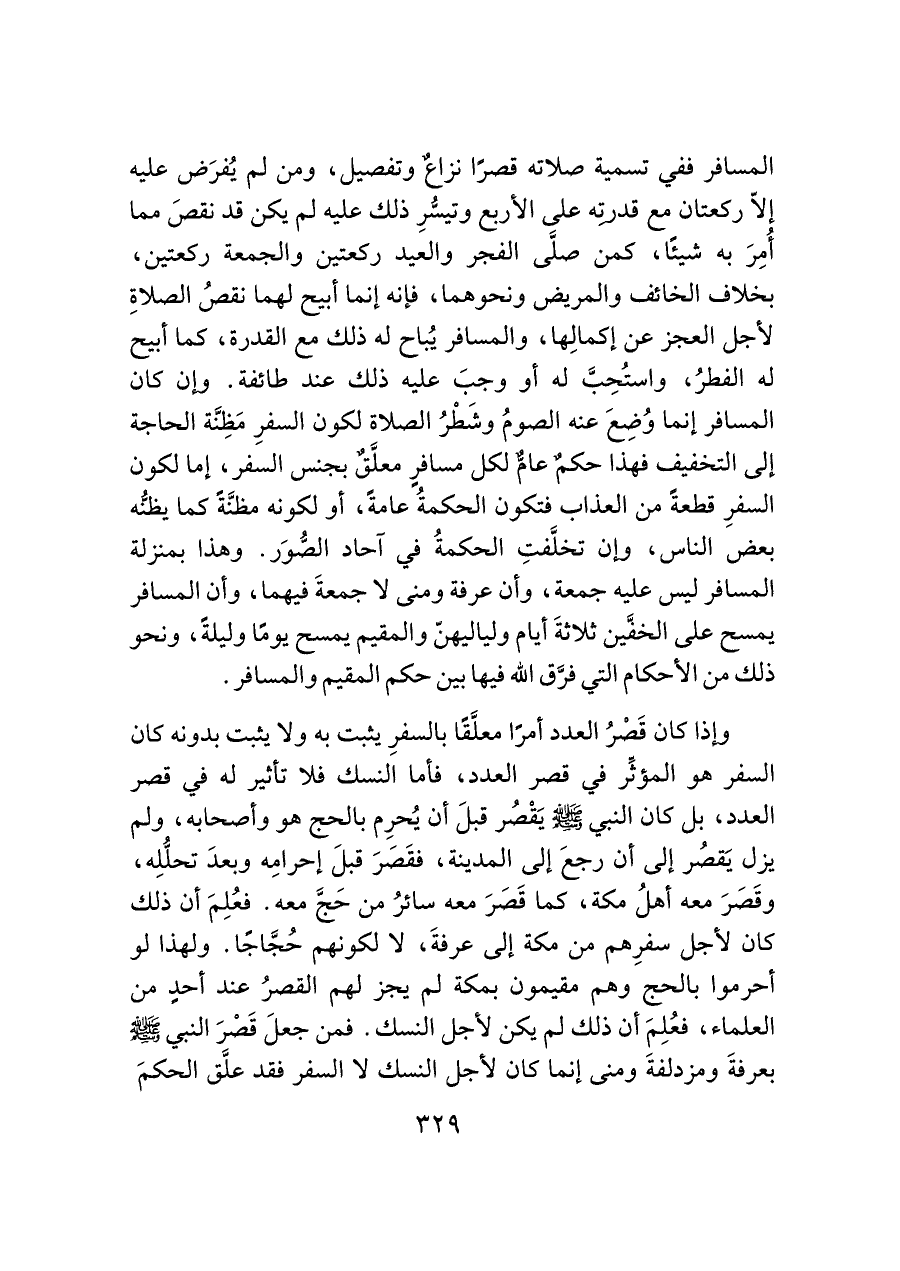 وإذا كان قَصْرُ العدد أمرًا معلَّقًا بالسفرِ يثبت به ولا يثبت بدونه كان السفر هو المؤثِّر في قصر العدد، فأما النسك فلا تأثير له في قصر العدد، بل كان النبي - صَلَّى اللَّهُ عَلَيْهِ وَسَلَّمَ - يَقْصُر قبلَ أن يُحرِم بالحج هو وأصحابه، ولم يزل يَقصُر إلى أن رجعَ إلى المدينة، فقَصَرَ قبلَ إحرامِه وبعدَ تحلُّلِه، وقَصَرَ معه أهلُ مكة، كما قَصَرَ معه سائرُ من حَجَّ معه. فعُلِمَ أن ذلك كان لأجل سفرِهم من مكة إلى عرفةَ، لا لكونهم حُجَّاجًا. ولهذا لو أحرموا بالحج وهم مقيمون بمكة لم يجز لهم القصرُ عند أحدٍ من العلماء، فعُلِمَ أن ذلك لم يكن لأجل النسك. فمن جعلَ قَصْرَ النبي - صَلَّى اللَّهُ عَلَيْهِ وَسَلَّمَ - بعرفةَ ومزدلفةَ ومنى إنما كان لأجل النسك لا السفر فقد علَّق الحكمَ