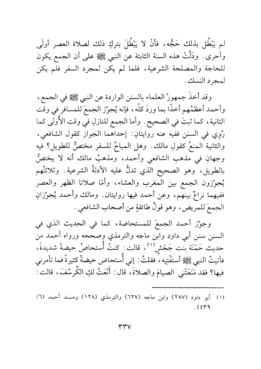 وجوَّز أحمد الجمعَ للمستحاضة، كما في الحديث الذي في السنن سنن أبي داود وابن ماجه والترمذي وصححه ورواه أحمد من حديث حَمْنَة بنت جَحْشٍ (¬١)، قالت: كنتُ أُستحاضُ حيضةً شديدةً، فأتيتُ النبي - صَلَّى اللَّهُ عَلَيْهِ وَسَلَّمَ - أستَفْتِيه، فقلتُ: إني أُستحاض حيضةً كثيرةً فما تأمرني فيها؟ فقد مَنَعَتْني الصيامَ والصلاةَ، قال: أَنْعَتُ لكِ الكرسُفَ، قالت: