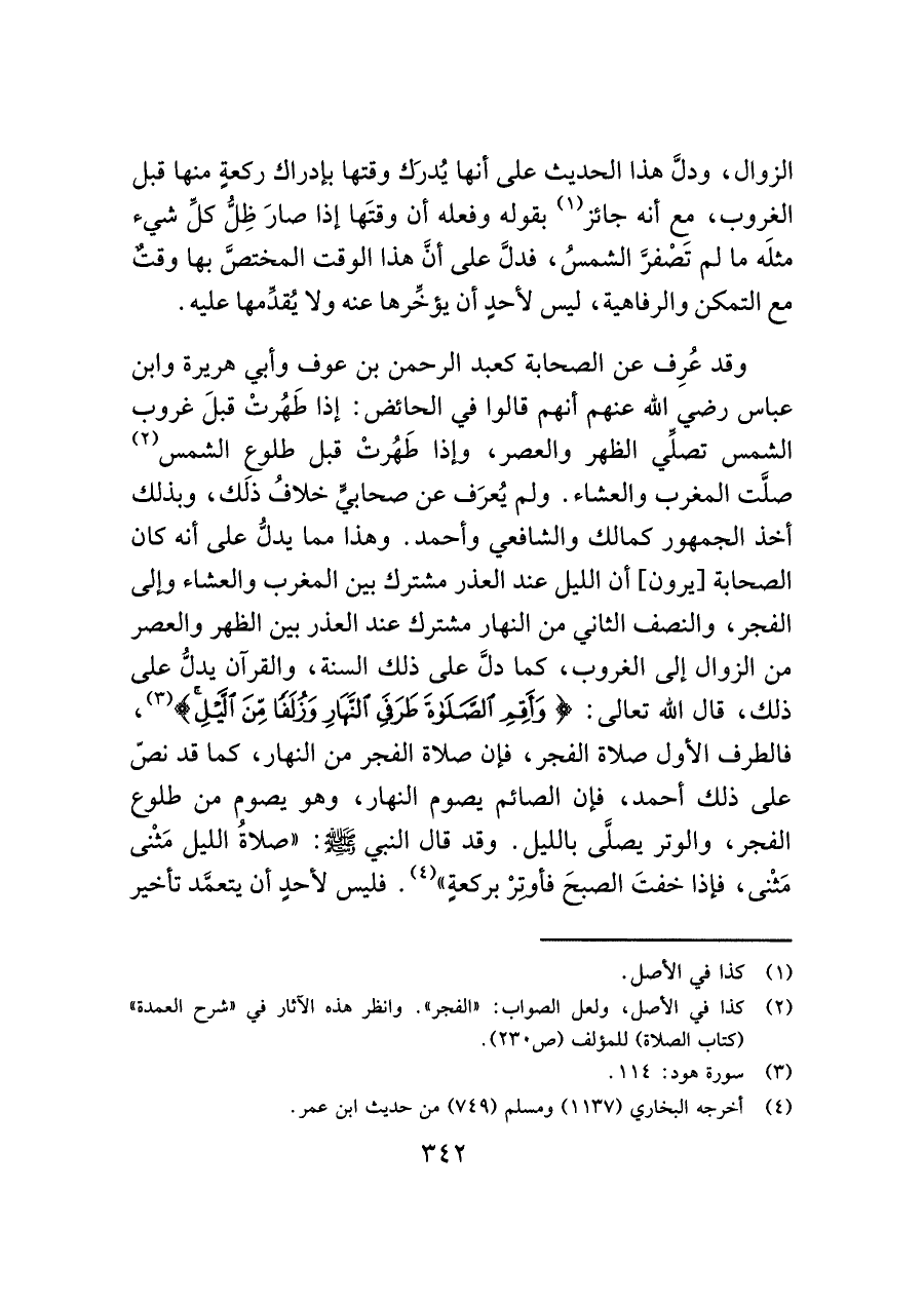 وقد عُرِف عن الصحابة كعبد الرحمن بن عوف وأبي هريرة وابن عباس رضي الله عنهم أنهم قالوا في الحائض: إذا طَهُرتْ قبلَ غروب الشمس تصلي الظهر والعصر، وإذا طَهُرتْ قبل طلوع الشمس (¬٢) صلَّت المغرب والعشاء. ولم يُعرَف عن صحابي خلافُ ذلَك، وبذلك أخذ الجمهور كمالك والشافعي وأحمد. وهذا مما يدلُّ على أنه كان الصحابة [يرون] أن الليل عند العذر مشترك بين المغرب والعشاء وإلى الفجر، والنصف الثاني من النهار مشترك عند العذر بين الظهر والعصر من الزوال إلى الغروب، كما دلَّ على ذلك السنة، والقرآن يدلُّ على ذلك، قال الله تعالى: (وَأَقِمِ الصَّلَاةَ طَرَفَيِ النَّهَارِ وَزُلَفًا مِنَ اللَّيْلِ) (¬٣)، فالطرف الأول صلاة الفجر، فإن صلاة الفجر من النهار، كما قد نصّ على ذلك أحمد، فإن الصائم يصوم النهار، وهو يصوم من طلوع الفجر، والوتر يصلَّى بالليل. وقد قال النبي - صَلَّى اللَّهُ عَلَيْهِ وَسَلَّمَ -: "صلاةُ الليل مَثْنى مَثْنى، فإذا خفتَ الصبحَ فأوترْ بركعة" (¬٤). فليس لأحد أن يتعمَّد تأخير