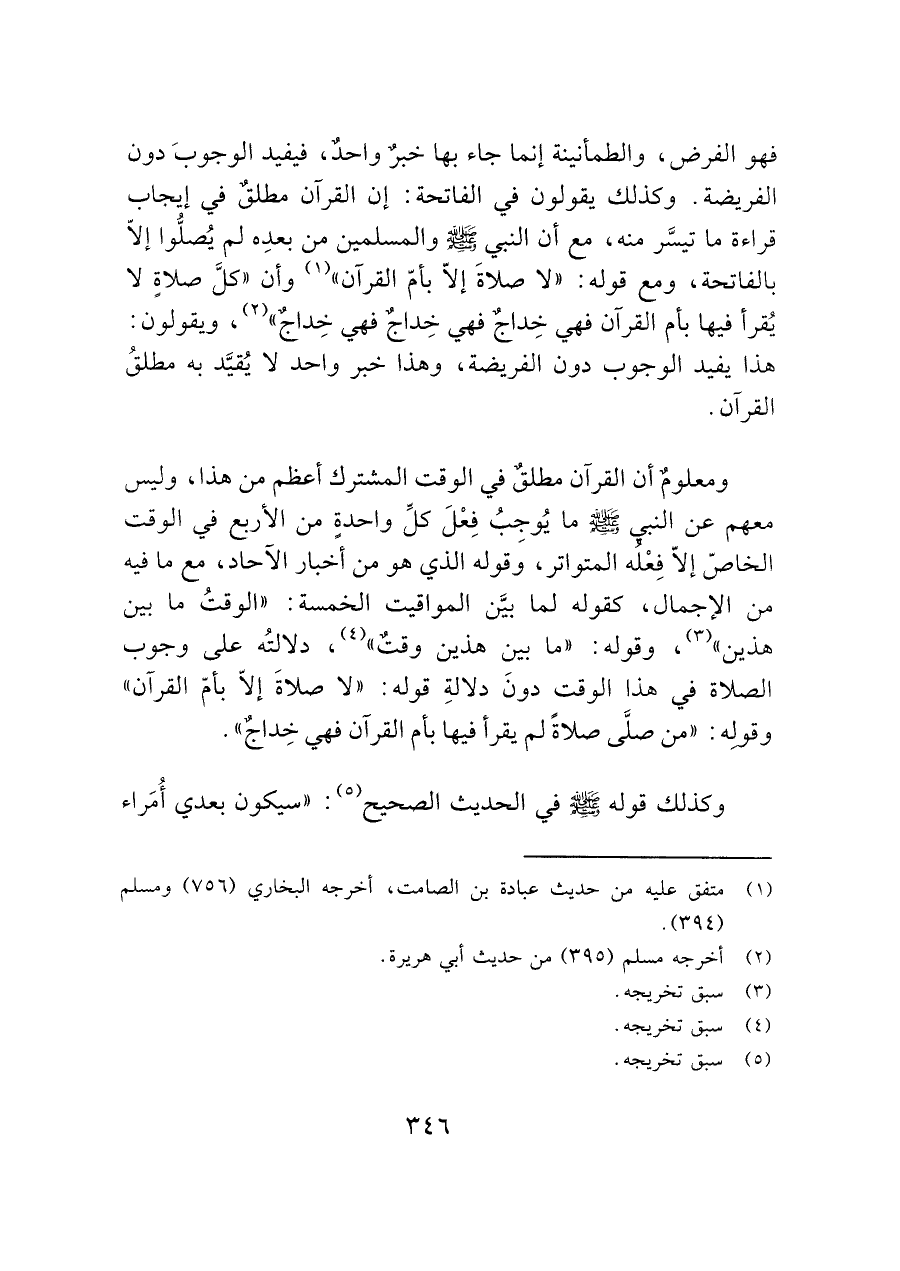 فهو الفرض، والطمأنينة إنما جاء بها خبر واحدٌ، فيفيد الوجوبَ دون الفريضة. وكذلك يقولون في الفاتحة: إن القرآن مطلق في إيجاب قراءة ما تيسَّر منه، مع أن النبي - صَلَّى اللَّهُ عَلَيْهِ وَسَلَّمَ - والمسلمين من بعدِه لم يُصلُّوا إلا بالفاتحة، ومع قوله: "لا صلاةَ إلا بأمّ القرآن" (¬١) وأن "كلَّ صلاةٍ لا يُقرأ فيها بأم القرآن فهي خِداجٌ فهي خِداجٌ فهي خِداجٌ" (¬٢)، ويقولون: هذا يفيد الوجوب دون الفريضة، وهذا خبر واحد لا يُقيَّد به مطلقُ القرآن.