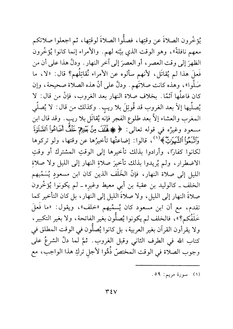 يُؤخِّرون الصلاةَ عن وقتِها، فصلُّوا الصلاةَ لوقتِها، ثم اجعلوا صلاتكم معهم نافلةً"، وهو الوقت الذي بيَّنه لهم. والأمراء إنما كانوا يُؤخِّرون الظهرَ إلى وقت العصر، أو العصرَ إلى آخر النهار. ودلَّ هذا على أن من فَعلَ هذا لم يُقاتَل، لأنهم سألوه عن الأمراء نُقاتِلُهم؟ قال: "لا، ما صَلَّوا"، وهذه كانت صلاتَهم. ودلَّ على أنّ هذه الصلاة صحيحة، وإن كان فاعلُها آثما. بخلاف صلاة النهار بعد الغروب، فإنّ من قال: لا يُصلِّيها إلا بعد الغروب قد قُوتلَ بلا ريبٍ. وكذلك من قال: لا يُصلي المغرب والعشاء إلا بعد طلوع الفجر فإنه يُقاتَل بلا ريبٍ. وقد قال ابن مسعود وغيرُه في قوله تعالى: (فَخَلَفَ مِنْ بَعْدِهِمْ خَلْفٌ أَضَاعُوا الصَّلَاةَ وَاتَّبَعُوا الشَّهَوَاتِ) (¬١)، قالوا: إضاعتُها تأخيرُها عن وقتها، ولو تركوها لكانوا كفارًا، وأرادوا بذلك تأخيرها إلى الوقتِ المشترك أو وقتِ الاضطرار، ولم يُريدوا بذلك تأخيرَ صلاةِ النهار إلى الليل ولا صلاةِ الليل إلى صلاة النهار، فإنّ الخَلَف الذين كان ابن مسعودٍ يُسَميهم الخلف -كالوليد بن عقبة بن أبي معيط وغيرِه- لم يكونوا يُؤخرون صلاةَ النهار إلى الليل، ولا صلاةَ الليل إلى النهار، بل كان التأخير كما تقدم، مع أن ابن مسعود كان يُسمِّيهم "خلف"، ويقول: "ما فَعلَ خَلَفُكم؟ "، فالخلف لم يكونوا يُصلُّون بغير الفاتحة، ولا بغير التكبير، ولا يقرأون القرآن بغير العربية، بل كانوا يُصلُّون في الوقت المطلق في كتاب الله في الطرف الثاني وقبل الغروب. ثم لما دلَّ الشرعُ على وجوب الصلاة في الوقت المختصّ ذُمُّوا لأجلِ تركِ هذا الواجب، مع