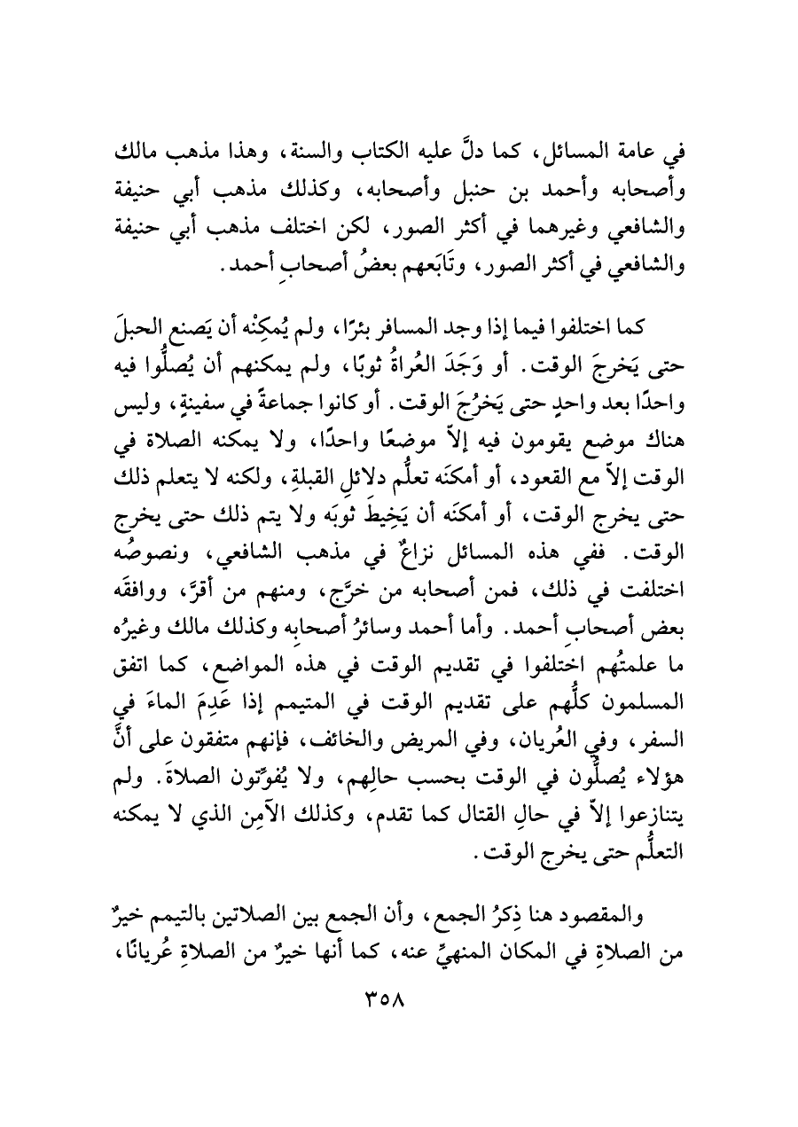 كما اختلفوا فيما إذا وجد المسافر بئرًا، ولم يُمكِنْه أن يَصنع الحبلَ حتى يَخرجَ الوقت. أو وَجَدَ العُراةُ ثوبًا، ولم يمكنهم أن يُصلُّوا فيه واحدًا بعد واحدٍ حتى يَخرُجَ الوقت. أو كانوا جماعةً في سفينةٍ، وليس هناك موضع يقومون فيه إلا موضعًا واحدًا، ولا يمكنه الصلاة في الوقت إلا مع القعود، أو أمكنَه تعلُّم دلائلِ القبلةِ، ولكنه لا يتعلم ذلك حتى يخرج الوقت، أو أمكنَه أن يَخِيطَ ثوبَه ولا يتم ذلك حتى يخرج الوقت. ففي هذه المسائل نزاعٌ في مذهب الشافعي، ونصوصُه اختلفت في ذلك، فمن أصحابه من خرَّج، ومنهم من أقرَّ، ووافقَه بعض أصحاب أحمد. وأما أحمد وسائرُ أصحابه وكذلك مالك وغيرُه ما علمتُهم اخَتلفوا في تقديم الوقت في هذهَ المواضع، كما اتفق المسلمون كلُّهم على تقديم الوقت في المتيمم إذا عَدِمَ الماءَ في السفر، وفي العُريان، وفي المريض والخائف، فإنهم متفقون على أنَّ هؤلاء يُصلون في الوقت بحسب حالِهم، ولا يُفوِّتون الصلاةَ. ولم يتنازعوا إلا في حالِ القتال كما تقدم، وكذلك الآمن الذي لا يمكنه التعلُّم حتى يخرج الوقت.