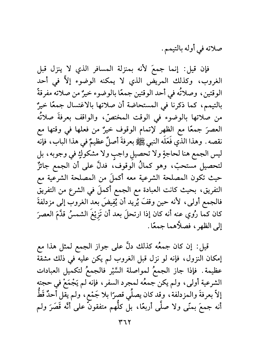 فإن قيل: إنما جمعَ لأنه بمنزلة المسافر الذي لا ينزل قبل الغروب، وكذلك المريض الذي لا يمكنه الوضوء إلا في أحد الوقتين، وصلاتُه في أحد الوقتين جمعًا بالوضوء خيرٌ من صلاته مفرقةً بالتيمم، كما ذكرنا في المستحاضة أن صلاتها بالاغتسال جمعًا خيرٌ من صلاتها بالوضوء في الوقت المختصّ، والواقف بعرفةَ صلاتُه العصرَ جمعًا مع الظهر لإتمام الوقوف خيرٌ من فعلها في وقتها مع نقصه. وهذا الذي فَعَلَه النبي - صَلَّى اللَّهُ عَلَيْهِ وَسَلَّمَ - بعرفةَ أصل عظيم في هذا الباب، فإنه ليس الجمع هنا لحاجةٍ ولا تحصيلِ واجب ولا مشكوك في وجوبه، بل لتحصيل مستحبّ، وهو كمالُ الوقوف، فدلَّ على أن الجمع جائز حيث تكون المصلحة الشرعية معه أكملَ من المصلحة الشرعية مع التفريق، بحيث كانت العبادة مع الجمع أكملَ في الشرع من التفريق فالجمع أولى، لأنه حين وقفَ يُريد أن يُفِيضَ بعد الغروب إلى مزدلفةَ كان كما رُوي عنه أنه كان إذا ارتحلَ بعد أن تَزِيْغَ الشمسُ قدَّمَ العصرَ إلى الظهر، فصلَاّهما جمعًا.