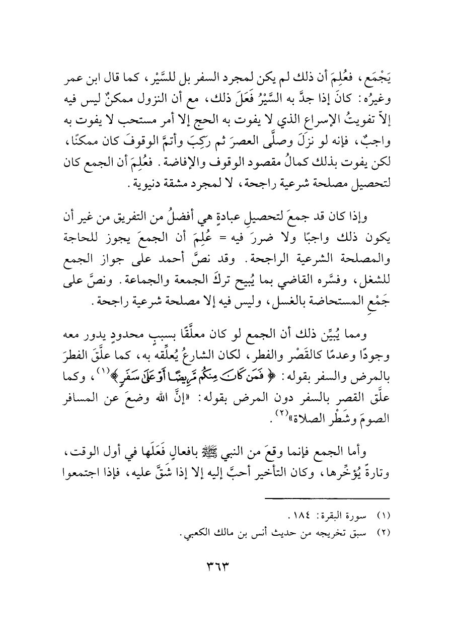 وإذا كان قد جمعَ لتحصيلِ عبادةٍ هي أفضلُ من التفريق من غير أن يكون ذلك واجبًا ولا ضررَ فيه= عُلِمَ أن الجمعَ يجوز للحاجة والمصلحة الشرعية الراجحة. وقد نصَّ أحمد على جواز الجمع للشغل، وفسَّره القاضي بما يُبيح تركَ الجمعة والجماعة. ونصَّ على جَمْعِ المستحاضة بالغسل، وليس فيه إلا مصلحة شرعية راجحة.