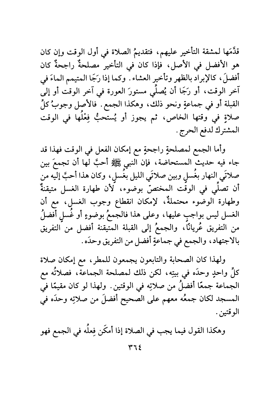 وأما الجمع لمصلحة راجحة مع إمكان الفعل في الوقت فهذا قد جاء فيه حديث المستحاضة، فإن النبي - صَلَّى اللَّهُ عَلَيْهِ وَسَلَّمَ - أحبَّ لها أن تجمعَ بين صلاتَي النهار بغُسلِ وبين صلاتَي الليل بغُسل، وكان هذا أحبَّ إليه من أن تصلِّي في الوقت المختصّ بوضوء، لأن طهارة الغسل متيقنة وطهارة الوضوء محتملة، لإمكان انقطاع وجوب الغسل، مع أن الغسل ليس بواجب عليها، وعلى هذا فالجمعُ بوضوءِ أو غُسلِ أفضلُ من التفريق عُريانًا، والجمعُ إلى القبلة المتيقنة أفضل من التفريق بالاجتهاد، والجمع في جماعة أفضل من التفريق وحدَه.