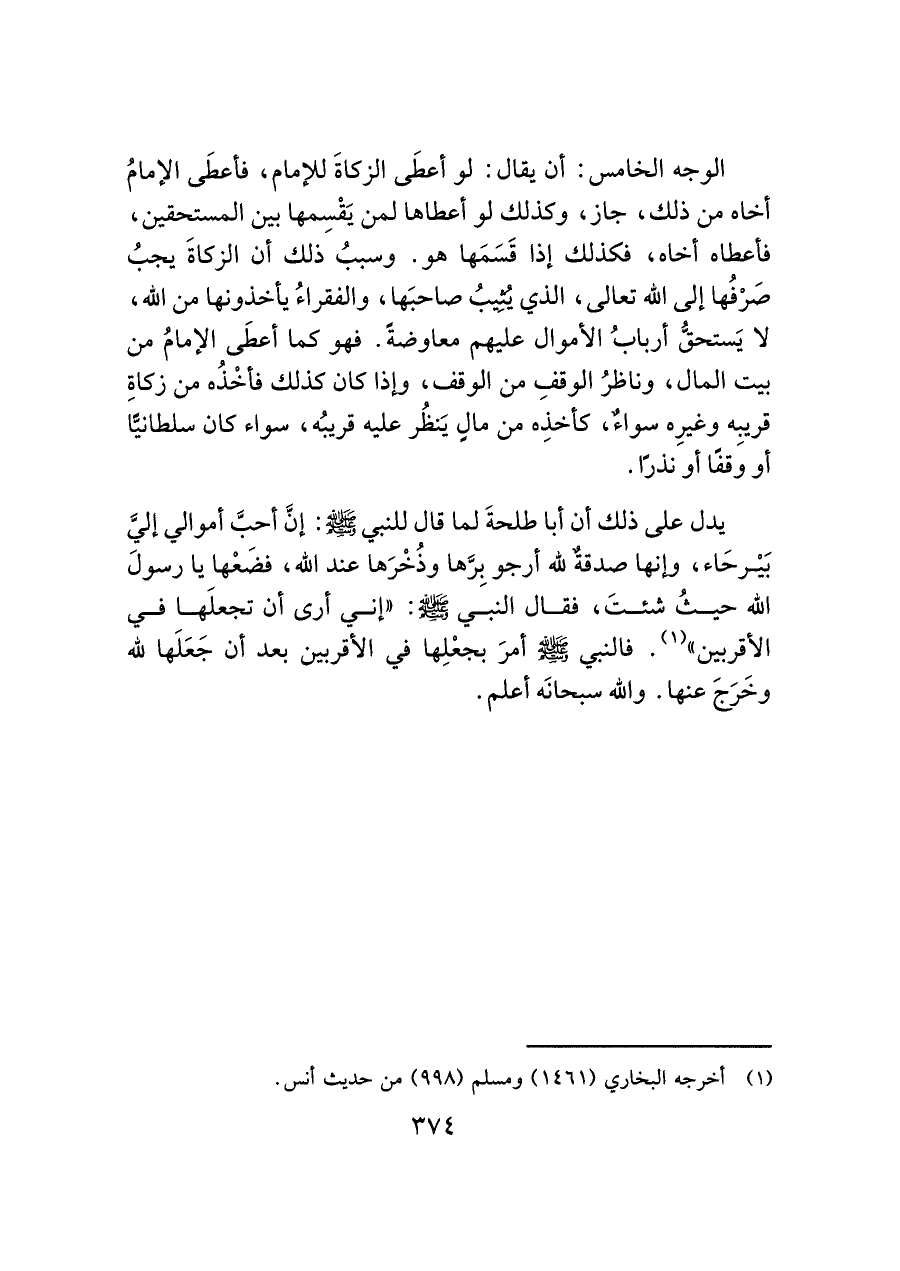 يدل على ذلك أن أبا طلحةَ لما قال للنبي - صَلَّى اللَّهُ عَلَيْهِ وَسَلَّمَ -: إنَّ أحبَّ أموالي إليَّ بَيْرحَاء، وإنها صدقةٌ لله أرجو بِرَّها وذُخْرَها عند الله، فضَعْها يا رسولَ الله حيثُ شئتَ، فقال النبي - صَلَّى اللَّهُ عَلَيْهِ وَسَلَّمَ -: "إني أرى أن تجعلَها في الأقربين" (¬١). فالنبي - صَلَّى اللَّهُ عَلَيْهِ وَسَلَّمَ - أمرَ بجعْلِها في الأقربين بعد أن جَعَلَها لله وخَرَجَ عنها. والله سبحانَه أعلم.