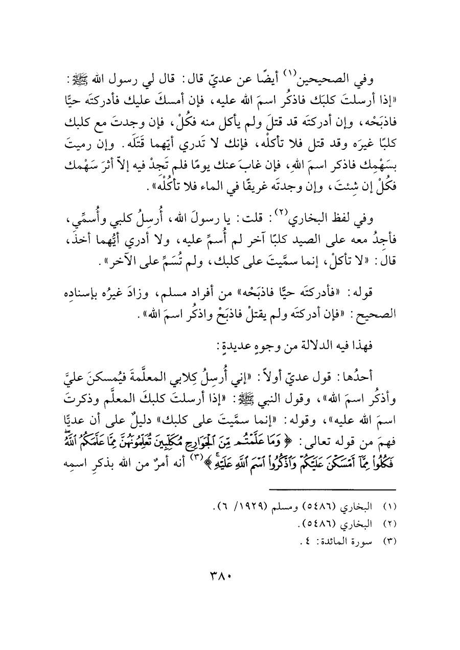 أحدُها: قول عديّ أولاً: "إني أُرسلُ كِلابي المعلَّمةَ فيُمسكنَ عليَّ وأذكُر اسمَ الله"، وقول النبي - صَلَّى اللَّهُ عَلَيْهِ وَسَلَّمَ -: "إذا أرسلتَ كلبكَ المعلَّم وذكرتَ اسمَ الله عليه"، وقوله: "إنما سمَّيتَ على كلبك" دليلٌ على أن عديا فهمَ من قوله تعالى: (وَمَا عَلَّمْتُمْ مِنَ الْجَوَارِحِ مُكَلِّبِينَ تُعَلِّمُونَهُنَّ مِمَّا عَلَّمَكُمُ اللَّهُ فَكُلُوا مِمَّا أَمْسَكْنَ عَلَيْكُمْ وَاذْكُرُوا اسْمَ اللَّهِ عَلَيْهِ) (¬٣) أنه أمرٌ من الله بذكرِ اسمِه