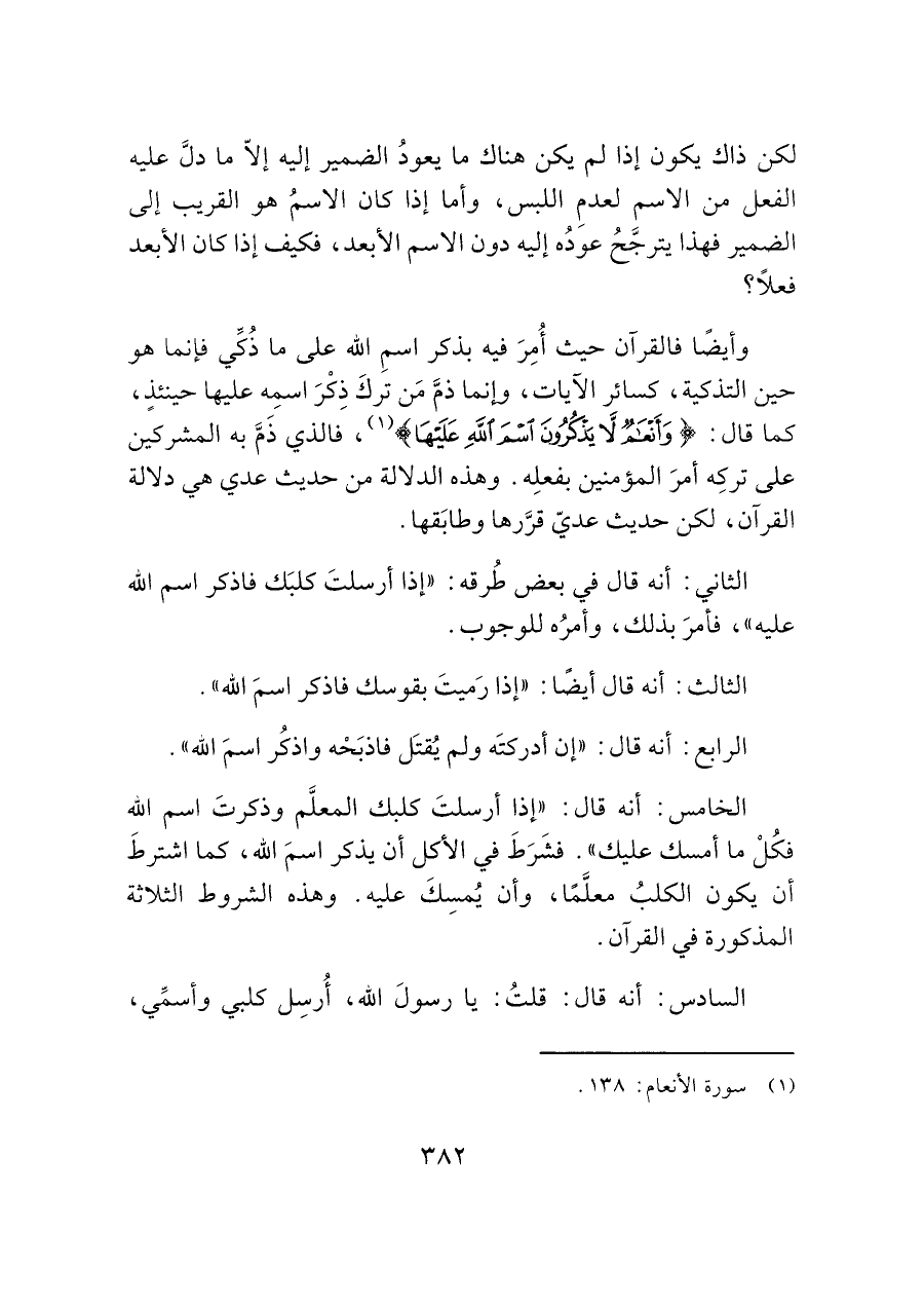 وأيضًا فالقرآن حيث أُمِرَ فيه بذكر اسمِ الله على ما ذُكِّي فإنما هو حين التذكية، كسائر الآيات، وإنما ذمَّ مَن تركَ ذِكْرَ اسمِه عليها حينئذٍ، كما قال: (وَأَنْعَامٌ لَا يَذْكُرُونَ اسْمَ اللَّهِ عَلَيْهَا) (¬١)، فالذي ذَمَّ به المشركين على تركِه أمرَ المؤمنين بفعلِه. وهذه الدلالة من حديث عدي هي دلالة القرآن، لكن حديث عديّ قرَّرها وطابَقها.