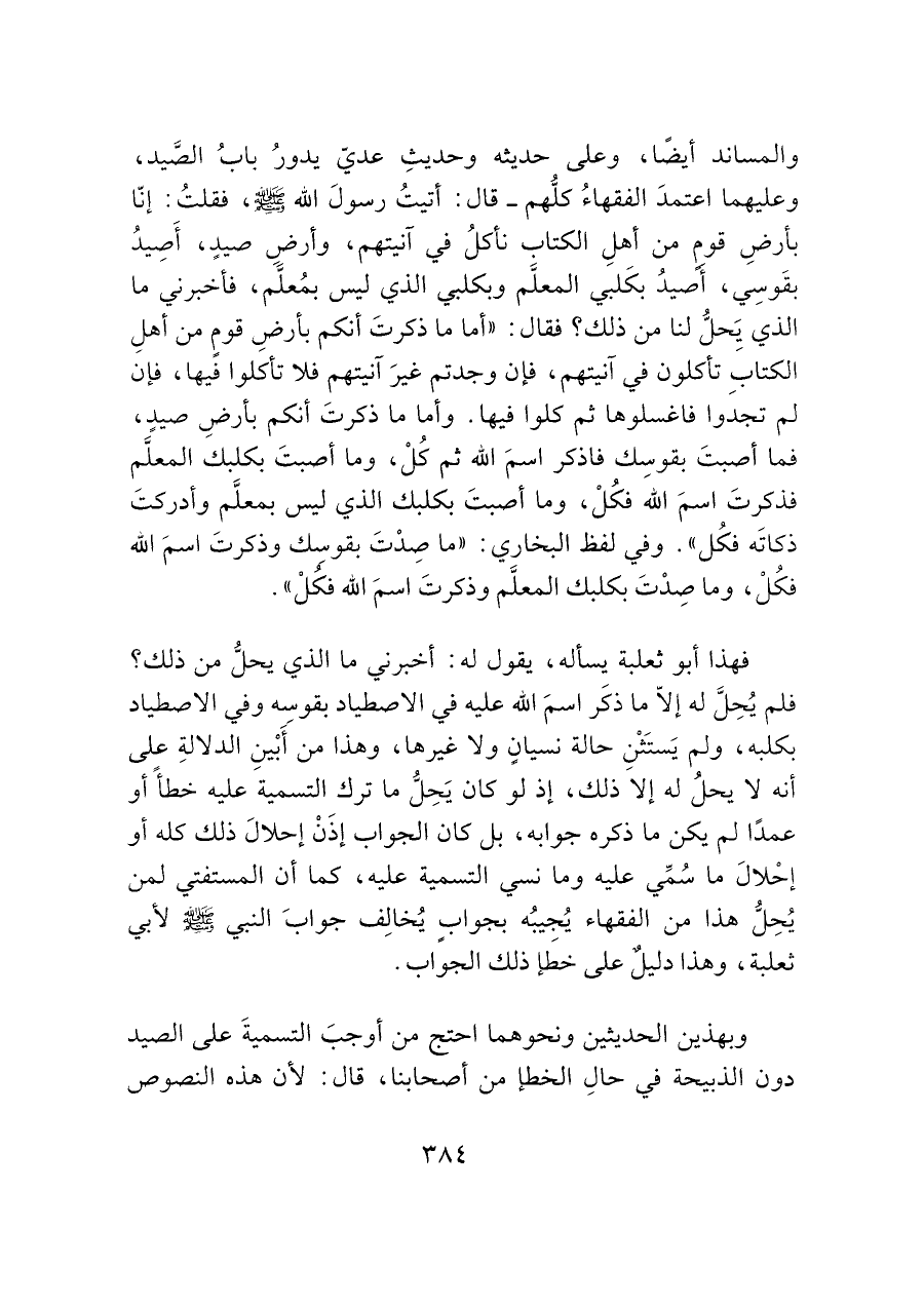 والمساند أيضًا، وعلى حديثه وحديثِ عديّ يدورُ بابُ الصَّيد، وعليهما اعتمدَ الفقهاءُ كلُّهم- قال: أتيتُ رسولَ الله - صَلَّى اللَّهُ عَلَيْهِ وَسَلَّمَ -، فقلتُ: إنّا بأرضِ قوم من أهلِ الكتاب نأكلُ في آنيتهم، وأرضِ صيدٍ، أَصِيدُ بقَوسِي، أصيدُ بكَلبي المعلَّم وبكلبي الذي ليس بمُعلَّم، فأخبرني ما الذي يَحلُّ لنا من ذلك؟ فقال: "أما ما ذكرتَ أنكم بأرضِ قومٍ من أهلِ الكتاب تأكلون في آنيتهم، فإن وجدتم غيرَ آنيتهم فلا تأكلوا فيها، فإن لم تجدَوا فاغسلوها ثم كلوا فيها. وأما ما ذكرتَ أنكم بأرضِ صيدٍ، فما أصبتَ بقوسِك فاذكر اسمَ الله ثم كُلْ، وما أصبتَ بكلبك المعلَّم فذكرتَ اسمَ الله فكُلْ، وما أصبتَ بكلبك الذي ليس بمعلَّم وأدركتَ ذكاتَه فكُل ". وفي لفظ البخاري: "ما صِدْتَ بقوسِك وذكرتَ اسمَ الله فكُلْ، وما صِدْتَ بكلبك المعلَّم وذكرتَ اسمَ الله فكُلْ".