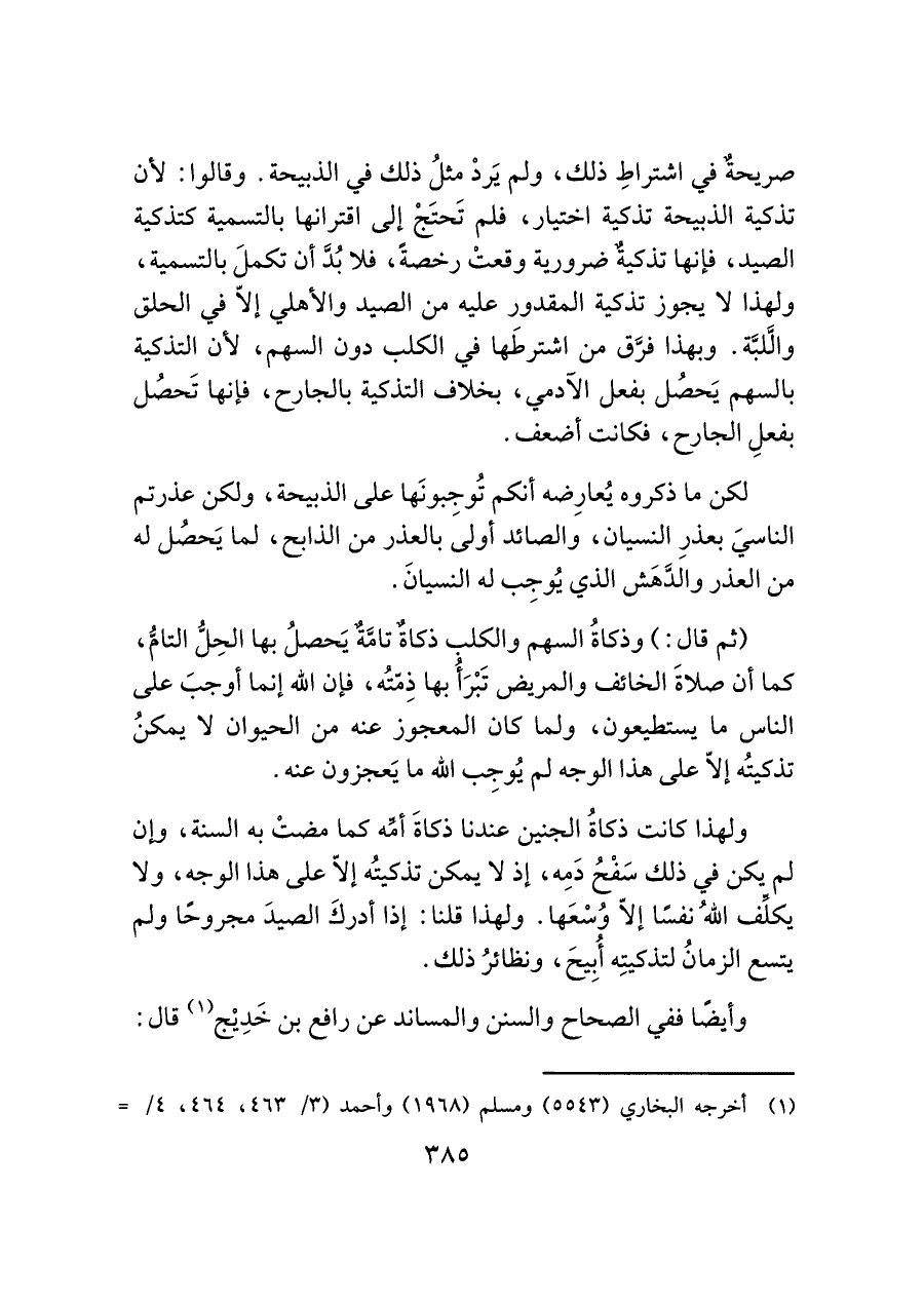 صريحةٌ في اشتراطِ ذلك، ولم يَردْ مثلُ ذلك في الذبيحة. وقالوا: لأن تذكية الذبيحة تذكية اختيار، فلم تَحتَجْ إلى اقترانها بالتسمية كتذكية الصيد، فإنها تذكيةٌ ضرورية وقعتْ رخصةً، فلا بُدَّ أن تكملَ بالتسمية، ولهذا لا يجوز تذكية المقدور عليه من الصيد والأهلي إلا في الحلق والَّلبَّة. وبهذا فرَّق من اشترطَها في الكلب دون السهم، لأن التذكية بالسهم يَحصُل بفعل الَادمي، بخلاف التذكية بالجارح، فإنها تَحصُل بفعلِ الجارح، فكانت أضعف.