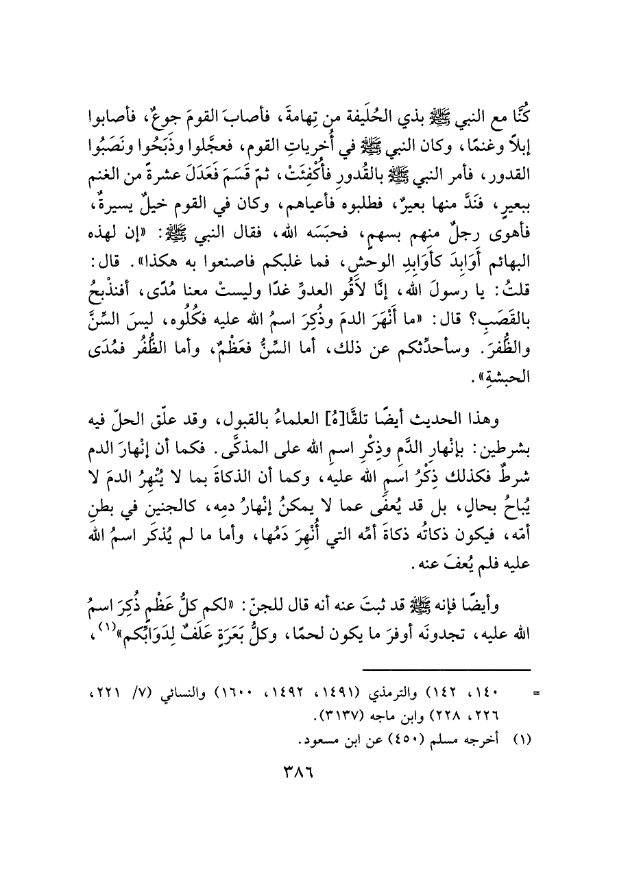 كنّا مع النبي - صَلَّى اللَّهُ عَلَيْهِ وَسَلَّمَ - بذي الحُلَيفة من تِهامةَ، فأصاب القومَ جِوع، فأصابوا إبلاً وغنمًا، وكان النبي - صَلَّى اللَّهُ عَلَيْهِ وَسَلَّمَ - في أُخرياتِ القوم، فعجَّلوا وذبَحُوا ونَصَبُوا القدور، فأمر النبي - صَلَّى اللَّهُ عَلَيْهِ وَسَلَّمَ - بالقُدورِ فأكفِئَتْ، ثمّ قَسَمَ فَعَدَلَ عشرةً من الغنم ببعيرٍ، فنَدَّ منها بعير، فطلبوه فأعياهم، وكان في القوم خيل يسيرة، فأهوى رجلٌ منهم بسهمٍ، فحبَسَه الله، فقال النبي - صَلَّى اللَّهُ عَلَيْهِ وَسَلَّمَ -: "إن لهذه البهائم أَوَابِدَ كأوًابِدِ الوحشِ، فما غلبكم فاصنعوا به هكذا". قال: قلتُ: يا رسولَ الله، إنا لَاقُو العدوّ غدًا وليستْ معنا مُدًى، أفنذْبحُ بالقَصَب؟ قال: "ما أَنْهَرَ الدمَ وذُكِرَ اسمُ الله عليه فكُلُوه، ليسَ السِّنَّ والظفًر. وسأحدِّثكم عن ذلك، أما السِّنُّ فعَظْم، وأما الظفُر فمُدَى الحبشةِ".