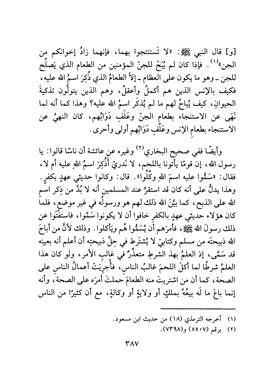 [و]، قال النبي - صَلَّى اللَّهُ عَلَيْهِ وَسَلَّمَ -: (لا تَستنتجوا بهما، فإنهما زادُ إخوانكم من الجن " (¬١). فماذا كان لم يُبَحْ للجنّ المؤمنين من الطعام الذي يَصلُح للجن- وهو ما يكون على العظام- إلا الطعامُ الذي ذُكِرَ اسمُ الله عليه، فكيف بالإنس الذين هم أكملُ وأعقلُ، وهم الذين يتولّون تذكيةَ الحيوانِ، كيف يُباحُ لهم ما لم يُذكَر اسمُ الله عليه؟ وهذا كما أنه لما نَهَى عن الاستنجاء بطعامِ الجنّ وعَلَفِ دَوَابِّهم، كان النهيُ عن الاستنجاء بطعامِ الإنس وعَلفِ دَوَابِّهم أولى وأحرى.