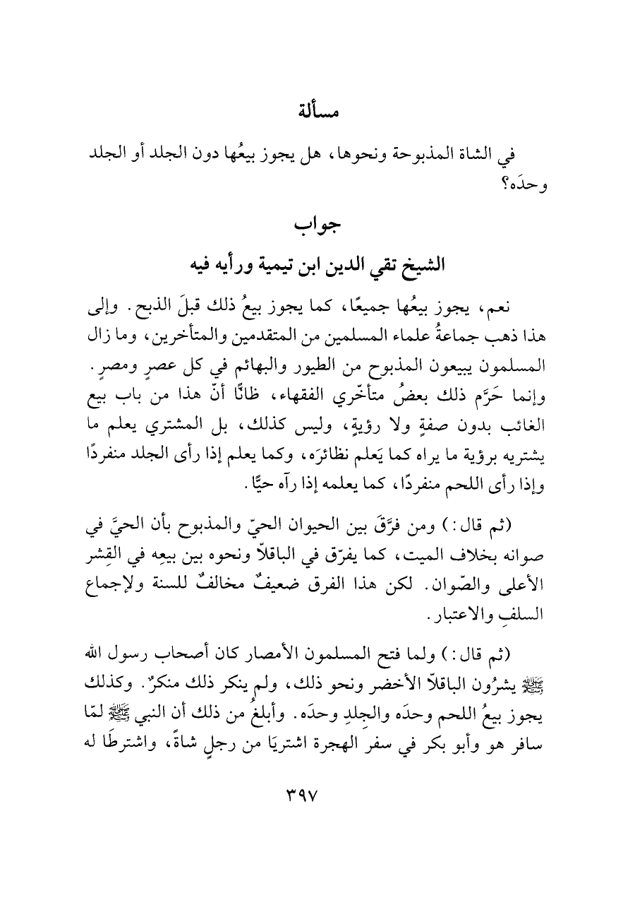الشيخ تقي الدين بن تيمية ورأيه فيه نعم، يجوز بيعُها جميعًا، كما يجوز بيعُ ذلك قبلَ الذبح. وإلى هذا ذهب جماعةُ علماء المسلمين من المتقدمين والمتأخرين، وما زال المسلمون يبيعون المذبوح من الطيور والبهائم في كل عصرٍ ومصرٍ.