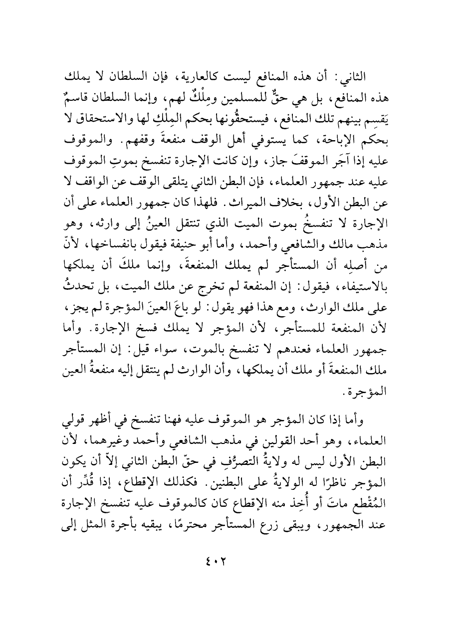الثاني: أن هذه المنافع ليست كالعارية، فإن السلطان لا يملك هذه المنافع، بل هي حقّ للمسلمين ومِلْكٌ لهم، وإنما السلطان قاسم يَقسِم بينهم تلك المنافع، فيستحقونها بحكم المِلْكِ لها والاستحقاق لا بحكم الإباحة، كما يستوفي أهل الوقف منفعةَ وقفهم. والموقوف عليه إذا آجَر الموقفَ جاز، وإن كانت الإجارة تنفسخ بموتِ الموقوف عليه عند جمهور العلماء، فإن البطن الثاني يتلقى الوقف عن الواقف لا عن البطن الأول، بخلاف الميراث. فلهذا كان جمهور العلماء على أن الإجارة لا تنفسخُ بموت الميت الذي تنتقل العينُ إلى وارثه، وهو مذهب مالك والشافعي وأحمد، وأما أبو حنيفة فيقول بانفساخها، لأنّ من أصلِه أن المستأجر لم يملك المنفعةَ، وإنما ملكَ أن يملكها بالاستيفاء، فيقول: إن المنفعة لم تخرج عن ملك الميت، بل تحدثُ على ملك الوارث، ومع هذا فهو يقول: لو باعَ العينَ المؤجرة لم يجز، لأن المنفعة للمستأجر، لأن المؤجر لا يملك فسخ الإجارة. وأما جمهور العلماء فعندهم لا تنفسخ بالموت، سواء قيل: إن المستأجر ملك المنفعةَ أو ملك أن يملكها، وأن الوارث لم ينتقل إليه منفعةُ العين المؤجرة.
