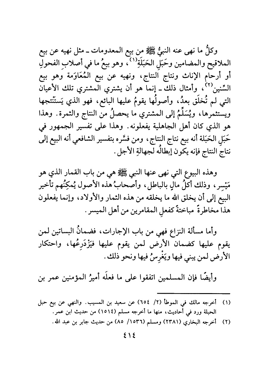 وكل ما نهى عنه النبي - صَلَّى اللَّهُ عَلَيْهِ وَسَلَّمَ - من بيع المعدومات- مثل نهيه عن بيع الملاقيح والمضامين وحَبَلِ الحَبَلَةِ (¬١)، وهو بيعُ ما في أصلابِ الفحولِ أو أرحام الإناث ونتاج النتاج، ونهيه عن بيع المُعَاوَمة وهو بيع السّنين (¬٢)، وأمثال ذلك- إنما هو أن يشتري المشتري تلك الأعيان التي لم تُخلَق بعدُ، وأصولُها يقومُ عليها البائع، فهو الذي يَستنتجها ويستثمرها، ويُسَلِّمُ إلى المشتري ما يحصلُ من النتاج والثمرة. وهذا هو الذي كان أهل الجاهلية يفعلونه. وهذا على تفسير الجمهور في حَبَلِ الحَبَلة أنه بيع نتاج النتاج، ومن فسره بتفسير الشافعي أنه البيع إلى نتاج النتاج فإنه يكون إبطالُه لجهالةِ الأجل.