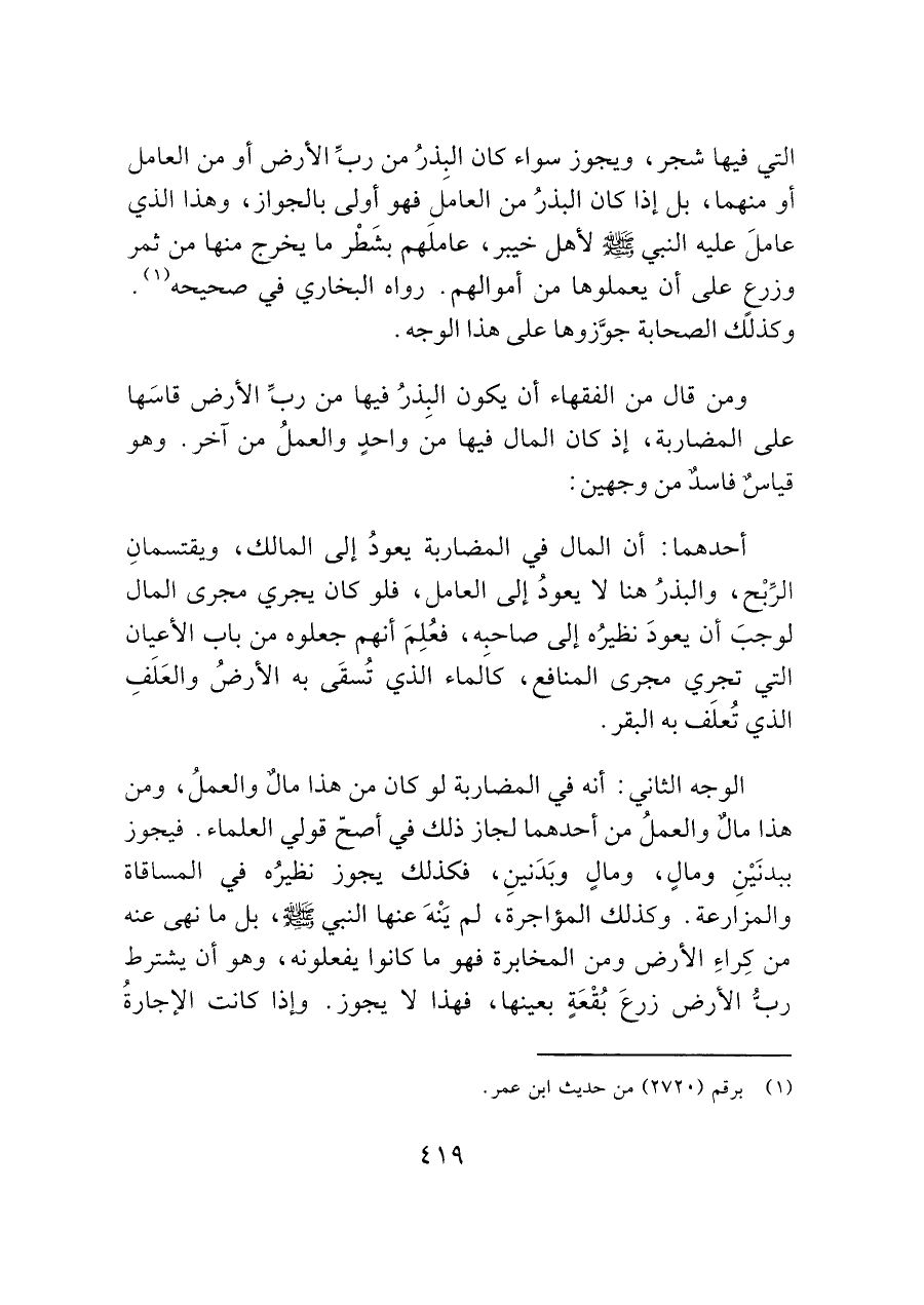 التي فيها شجر، ويجوز سواء كان البذرُ من ربِّ الأرض أو من العامل أو منهما، بل إذا كان البذرُ من العامَل فهو أولى بالجواز، وهذا الذي عاملَ عليه النبي - صَلَّى اللَّهُ عَلَيْهِ وَسَلَّمَ - لأهل خيبر، عاملَهم بشَطْر ما يخرج منها من ثمر وزرعٍ على أن يعملوها من أموالهم. رواه البخاري في صحيحه (¬١).