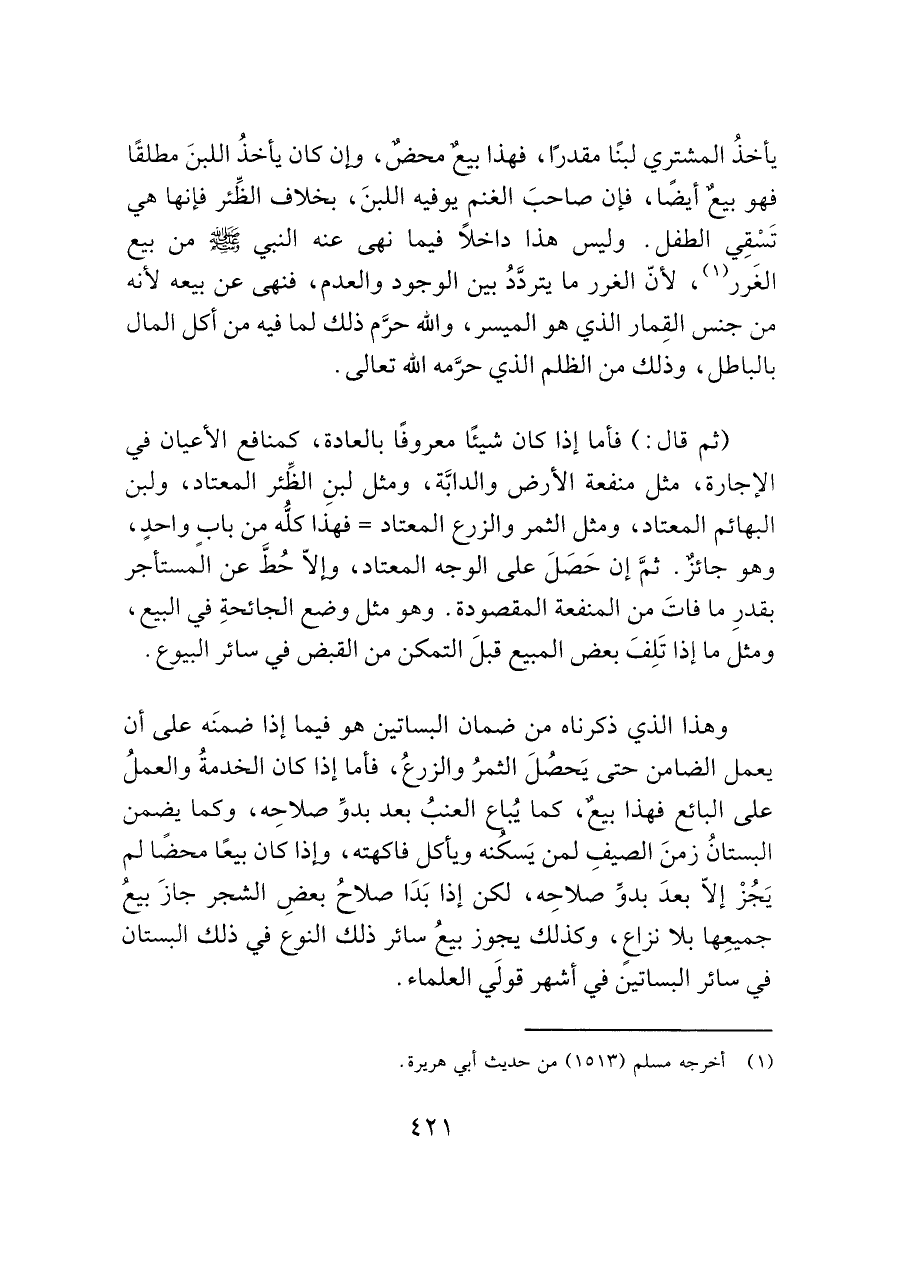يأخذُ المشتري لبنًا مقدرا، فهذا بيع محض، وإن كان يأخذُ اللبنَ مطلقًا فهو بيع أيضًا، فإن صاحبَ الغنم يوفيه اللبنَ، بخلاف الظِّئر فإنها هي تَسْقِي الطفل. وليس هذا داخلاً فيما نهى عنه النبي - صَلَّى اللَّهُ عَلَيْهِ وَسَلَّمَ - من بيع الغَرر (¬١)، لأنّ الغرر ما يتردَّدُ بين الوجود والعدم، فنهى عن بيعه لأنه من جنس القِمار الذي هو الميسر، والله حرَّم ذلك لما فيه من أكل المال بالباطل، وذلك من الظلم الذي حرَّمه الله تعالى.