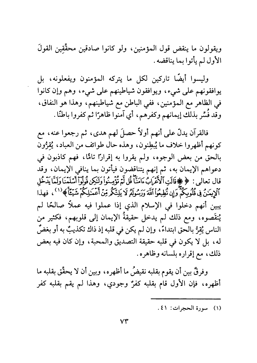 فالقراَن يدلّ على أنهم أولاً حصلَ لهم هدى، ثم رجعوا عنه، مع كونهم أظهروا خلاف ما يُبطِنون، وهذه حال طوائف من العباد، يُقِرون بالحق من بعض الوجوه، ولم يقروا به إقرارًا تامًّا، فهم كاذبون في دعواهم الإيمان به، ثم إنهم يتناقضون فيأتون بما ينافي الإيمان، وقد قال تعالى: (قَالَتِ الْأَعْرَابُ آَمَنَّا قُلْ لَمْ تُؤْمِنُوا وَلَكِنْ قُولُوا أَسْلَمْنَا وَلَمَّا يَدْخُلِ الْإِيمَانُ فِي قُلُوبِكُمْ وَإِنْ تُطِيعُوا اللَّهَ وَرَسُولَهُ لَا يَلِتْكُمْ مِنْ أَعْمَالِكُمْ شَيْئًا) (¬١)، فهذا يبين أنهم دخلوا في الإسلام الذي إذا عملوا فيه عملاً صالحًا لم يُنقَصوه، ومع ذلك لم يدخل حقيقةُ الإيمان إلى قلوبهم، فكثير من الناس يُقِر بالحق ابتداءً، وإن لم يكن في قلبه إذ ذاك تكذيبٌ به أو بغضٌ له، بل لا يكون في قلبه حقيقة التصديق والمحبة، وإن كان فيه بعض ذلك، مع إقراره بلسانه وظاهره.