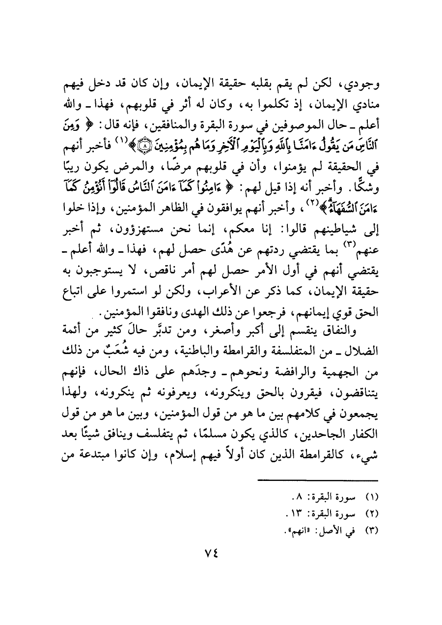 وجودي، لكن لم يقم بقلبه حقيقة الإيمان، وإن كان قد دخل فيهم منادي الإيمان، إذ تكلموا به، وكان له أثر في قلوبهم، فهذا- والله أعلم- حال الموصوفين في سورة البقرة والمنافقين، فإنه قال: (وَمِنَ النَّاسِ مَنْ يَقُولُ آَمَنَّا بِاللَّهِ وَبِالْيَوْمِ الآخر وَمَا هُمْ بِمُؤْمِنِينَ (٨)) (¬١) فأخبر أنهم في الحقيقة لم يؤمنوا، وأن في قلوبهم مرضًا، والمرض يكون ريبًا وشكًّا. وأخبر أنه إذا قيل لهم: (آَمِنُوا كَمَا آَمَنَ النَّاسُ قَالُوا أَنُؤْمِنُ كَمَا آَمَنَ السُّفَهَاءُ) (¬٢)، وأخبر أنهم يوافقون في الظاهر المؤمنين، وإذا خلوا إلى شياطينهم قالوا: إنا معكم، إنما نحن مستهزؤون، ثم أخبر عنهم (¬٣) بما يقتضي ردتهم عن هُدًى حصل لهم، فهذا- والله أعلم- يقتضي أنهم في أول الأمر حصل لهم أمر ناقص، لا يستوجبون به حقيقة الإيمان، كما ذكر عن الأعراب، ولكن لو استمروا على اتباع الحق قوي إيمانهم، فرجعوا عن ذلك الهدى ونافقوا المؤمنين.