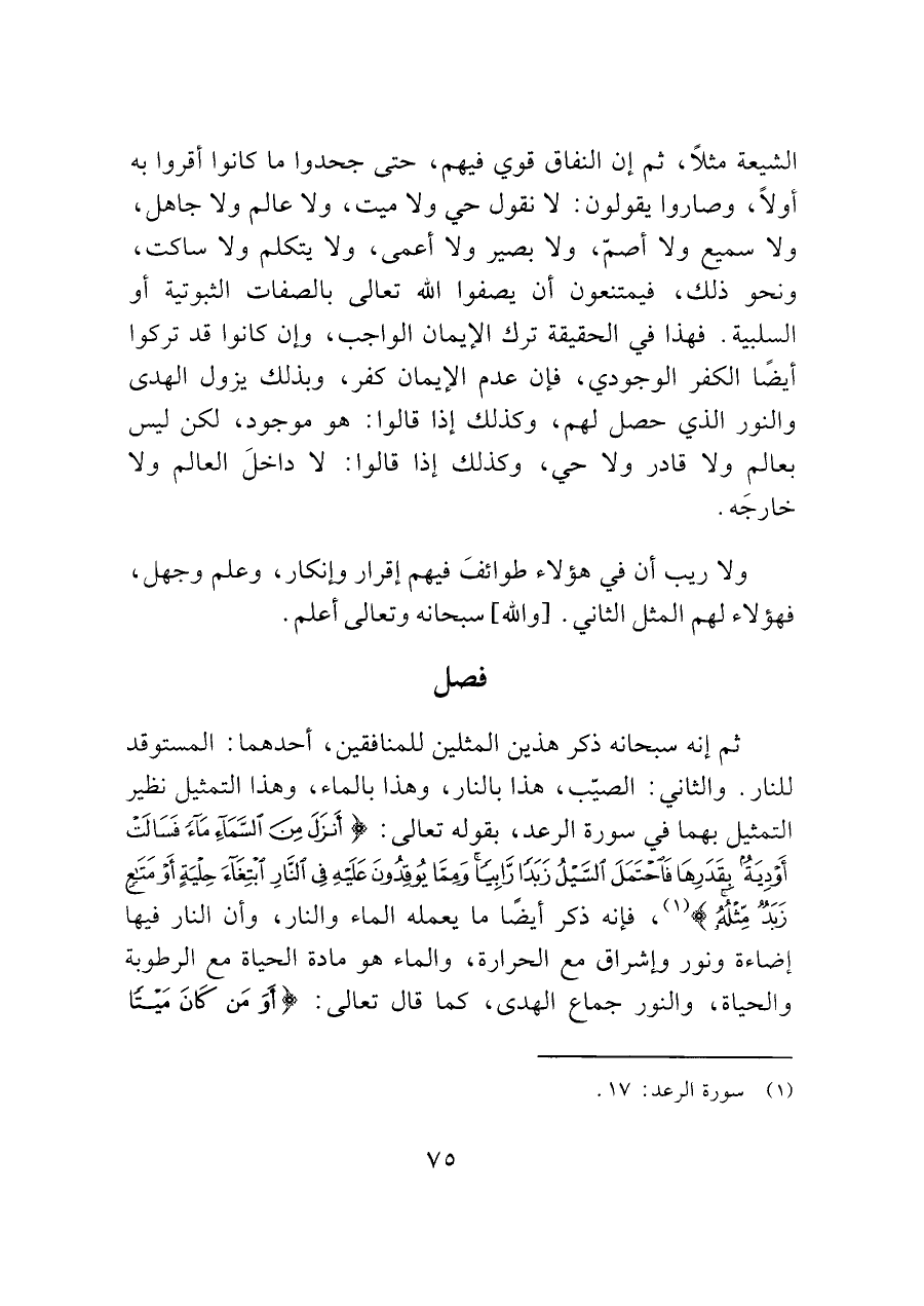 الشيعة مثلاً، ثم إن النفاق قوي فيهم، حتى جحدوا ما كانوا أقروا به أولاً، وصاروا يقولون: لا نقول حي ولا ميت، ولا عالم ولا جاهل، ولا سميع ولا أصمّ، ولا بصير ولا أعمى، ولا يتكلم ولا ساكت، ونحو ذلك، فيمتنعون أن يصفوا الله تعالى بالصفات الثبوتية أو السلبية. فهذا في الحقيقة ترك الإيمان الواجب، وإن كانوا قد تركوا أيضًا الكفر الوَجودي، فإن عدم الإيمان كفر، وبذلك يزول الهدى والنور الذي حصل لهم، وكذلك إذا قالوا: هو موجود، لكن ليس بعالم ولا قادر ولا حي، وكذلك إذا قالوا: لا داخلَ العالم ولا خارجَه.