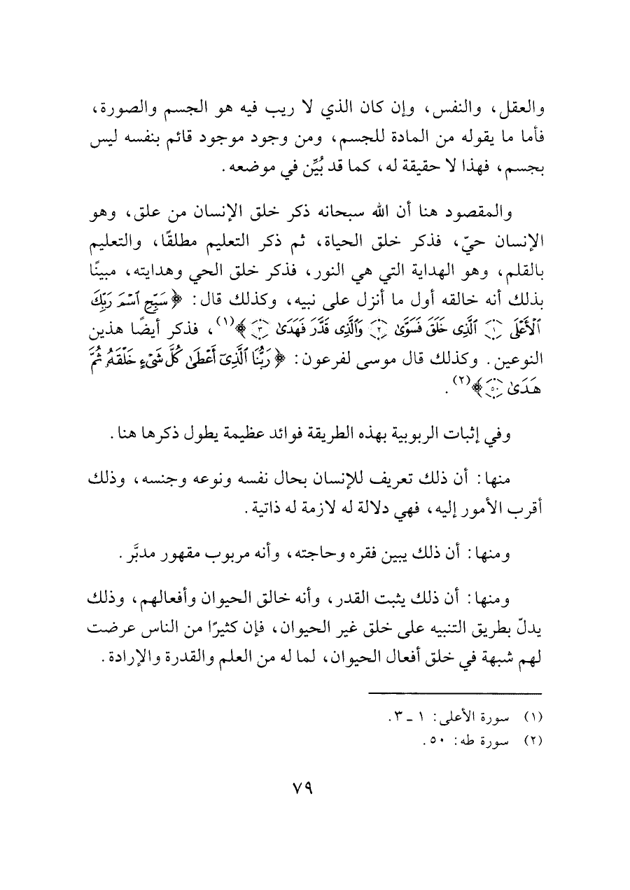 والمقصود هنا أن الله سبحانه ذكر خلق الإنسان من علق، وهو الإنسان حيّ، فذكر خلق الحياة، ثم ذكر التعليم مطلقًا، والتعليم بالقلم، وهو الهداية التي هي النور، فذكر خلق الحي وهدايته، مبينًا بذلك أنه خالقه أول ما أنزل على نبيه، وكذلك قال: (سَبِّحِ اسْمَ رَبِّكَ الْأَعْلَى (١) الَّذِي خَلَقَ فَسَوَّى (٢) وَالَّذِي قَدَّرَ فَهَدَى (٣)) (¬١)، فذكر أيضًا هذين النوعين. وكذلك قال موسى لفرعون: (الَّذِي أَعْطَى كُلَّ شَيْءٍ خَلْقَهُ ثُمَّ هَدَى (٥٠)) (¬٢).