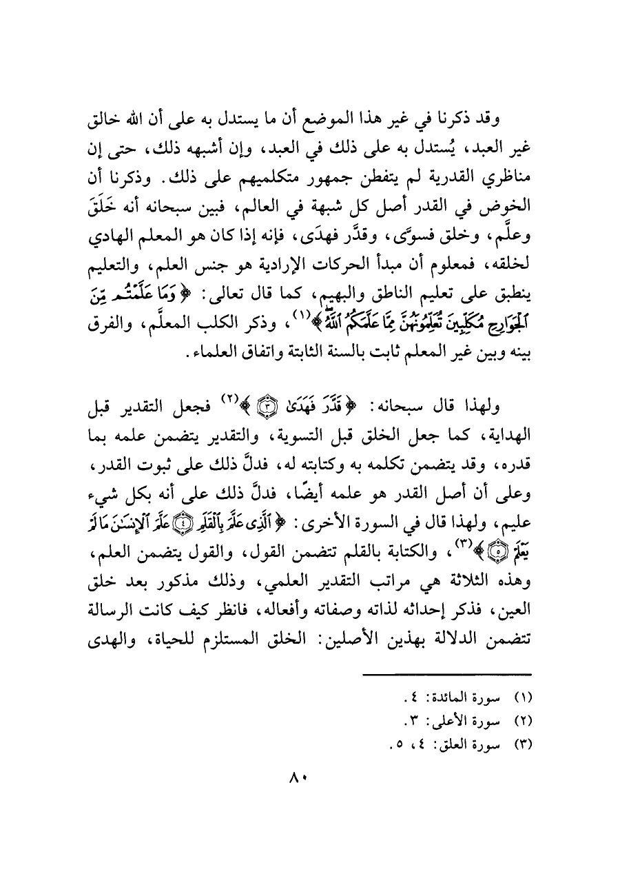 ولهذا قال سبحانه: (قدر فهدى (٣)) (¬٢) فجعل التقدير قبل الهداية، كما جعل الخلق قبل التسوية، والتقدير يتضمن علمه بما قدره، وقد يتضمن تكلمه به وكتابته له، فدلَّ ذلك على ثبوت القدر، وعلى أن أصل القدر هو علمه أيضًا، فدلَّ ذلك على أنه بكل شيء عليم، ولهذا قال في السورة الأخرى: (الَّذِي عَلَّمَ بِالْقَلَمِ (٤) عَلَّمَ الْإِنْسَانَ مَا لَمْ يَعْلَمْ (٥)) (¬٣)، والكتابة بالقلم تتضمن القول، والقول يتضمن العلم، وهذه الثلاثة هي مراتب التقدير العلمي، وذلك مذكور بعد خلق العين، فذكر إحداثه لذاته وصفاته وأفعاله، فانظر كيف كانت الرسالة تتضمن الدلالة بهذين الأصلين: الخلق المستلزم للحياة، والهدى