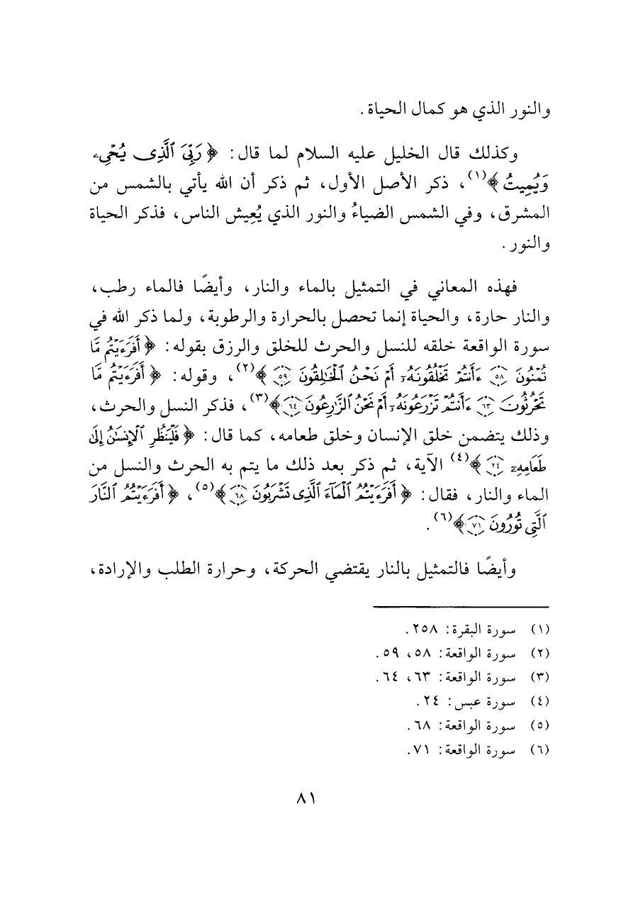 فهذه المعاني في التمثيل بالماء والنار، وأيضا فالماء رطب، والنار حارة، والحياة إنما تحصل بالحرارة والرطوبة، ولما ذكر الله في سورة الواقعة خلقه للنسل والحرث للخلق والرزق بقوله: (أَفَرَأَيْتُمْ مَا تُمْنُونَ (٥٨) أَأَنْتُمْ تَخْلُقُونَهُ أَمْ نَحْنُ الْخَالِقُونَ (٥٩)) (¬٢)، وقوله: (أَفَرَأَيْتُمْ مَا تَحْرُثُونَ (٦٣) أَأَنْتُمْ تَزْرَعُونَهُ أَمْ نَحْنُ الزَّارِعُونَ (٦٤)) (¬٣)، فذكر النسل والحرث، وذلك يتضمن خلق الإنسان وخلق طعامه، كما قال: (فَلْيَنْظُرِ الْإِنْسَانُ إِلَى طَعَامِهِ (٢٤)) (¬٤) الآية، ثم ذكر بعد ذلك ما يتم به الحرث والنسل من الماء والنار، فقال: (أَفَرَأَيْتُمُ الْمَاءَ الَّذِي تَشْرَبُونَ (٦٨)) (¬٥)، (أَفَرَأَيْتُمُ النَّارَ الَّتِي تُورُونَ (٧١)) (¬٦).