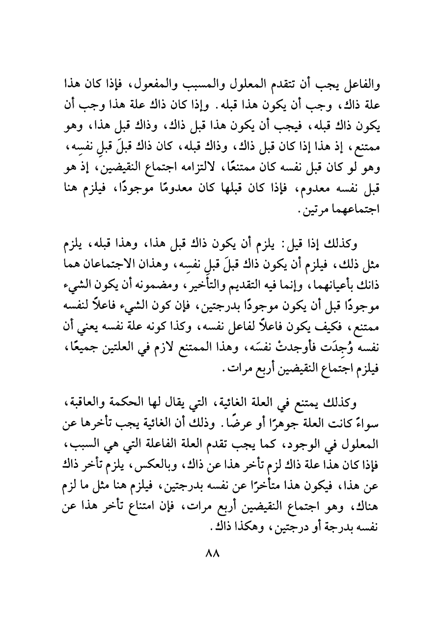 وكذلك يمتنع في العلة الغائية، التي يقال لها الحكمة والعاقبة، سواءً كانت العلة جوهرًا أو عرضًا. وذلك أن الغائية يجب تأخرها عن المعلول في الوجود، كما يجب تقدم العلة الفاعلة التي هي السبب، فإذا كان هذا علة ذاك لزم تاخر هذا عن ذاك، وبالعكس، يلزم تاخر ذاك عن هذا، فيكون هذا متاخرًا عن نفسه بدرجتين، فيلزم هنا مثل ما لزم هناك، وهو اجتماع النقيضين أربع مرات، فإن امتناع تأخر هذا عن نفسه بدرجة أو درجتين، وهكذا ذاك.
