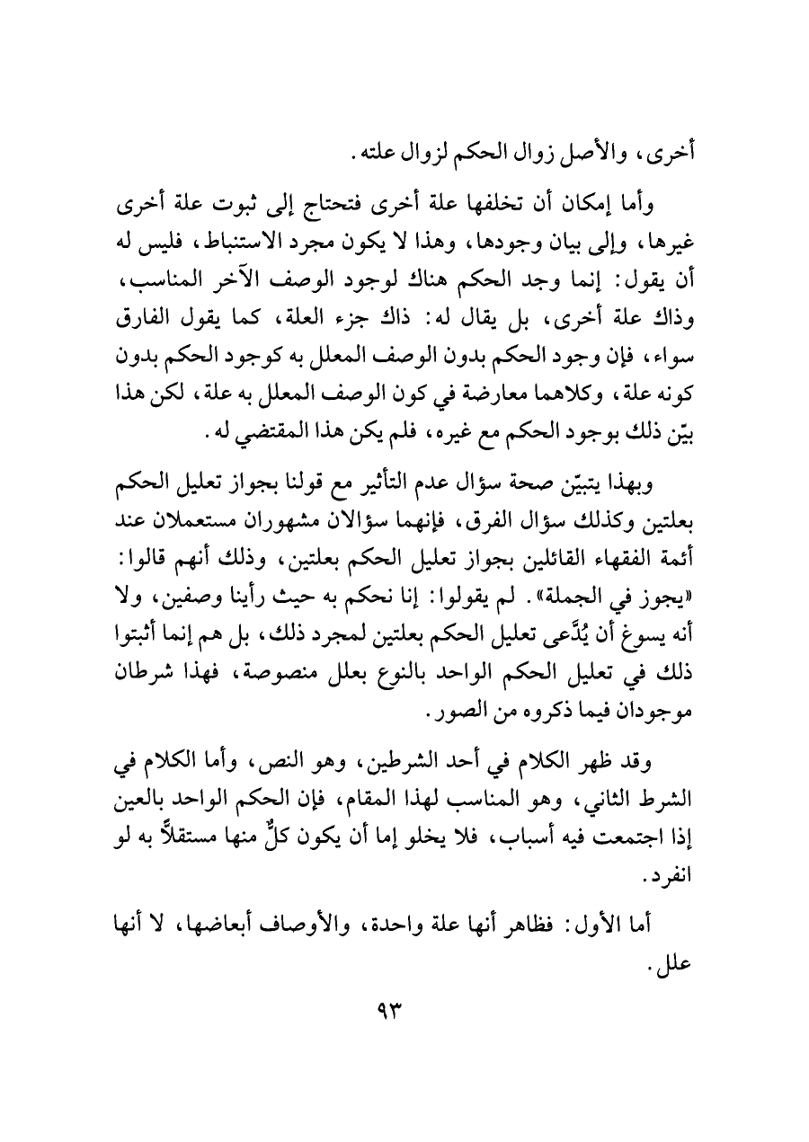 وبهذا يتبيّن صحة سؤال عدم التأثير مع قولنا بجواز تعليل الحكم بعلتين وكذلك سؤال الفرق، فإنهما سؤالان مشهوران مستعملان عند أئمة الفقهاء القائلين بجواز تعليل الحكم بعلتين، وذلك أنهم قالوا: "يجوز في الجملة". لم يقولوا: إنا نحكم به حيث رأينا وصفين، ولا أنه يسوغ أن يُدَّعى تعليل الحكم بعلتين لمجرد ذلك، بل هم إنما أثبتوا ذلك في تعليل الحكم الواحد بالنوع بعلل منصوصة، فهذا شرطان موجودان فيما ذكروه من الصور.