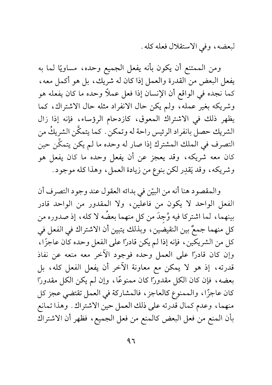 ومن الممتنع أن يكون بأنه يفعل الجميع وحده، مساويًا لما به يفعل البعض من القدرة والعمل إذا كان له شريك، بل هو أكمل معه، كما نجده في الواقع أن الإنسان إذا فعل عملاً وحده ما كان يفعله هو وشريكه بغير عمله، ولم يكن حالى الانفراد مثله حال الاشتراك، كما يظهر ذلك في الاشتراك المعوق، كازدحام الرؤساء، فإنه إذا زال الشريك حصل بانفراد الرئيس راحة له وتمكن. كما يتمكَّن الشريكُ من التصرف في الملك المشترك إذا صار له وحده ما لم يكن يتمكَّن حين كان معه شريكه، وقد يعجز عن أن يفعل وحده ما كان يفعل هو وشريكه، وقد يَقدِر لكن بنوع من زيادة العمل، وهذا كله موجود.