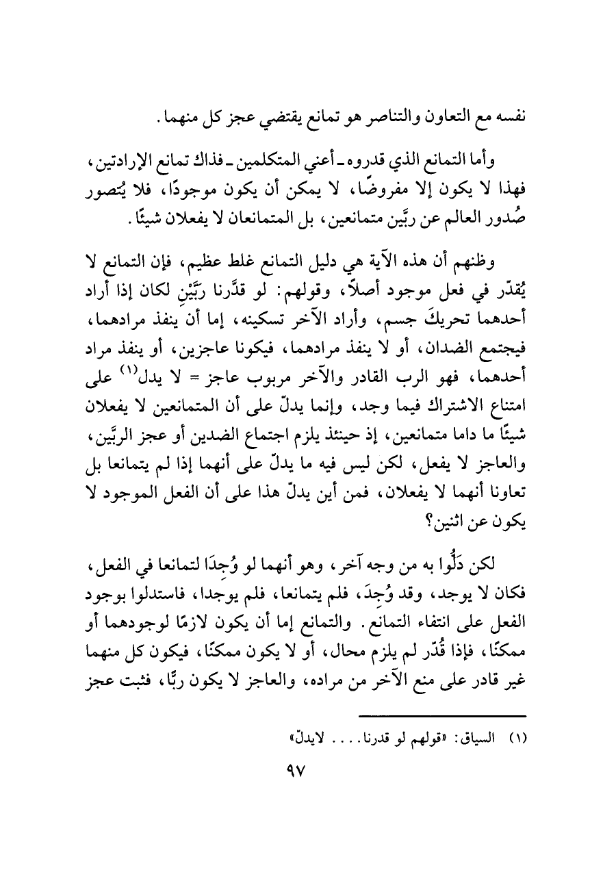 لكن دَلُوا به من وجه آخر، وهو أنهما لو وُجدَا لتمانعا في الفعل، فكان لا يوجد، وقد وُجدَ، فلم يتمانعا، فلم يوجَدا، فاستدلوا بوجود الفعل على انتفاء التمانَع. والتمانع إما أن يكون لازمًا لوجودهما أو ممكنًا، فإذا قُدّر لم يلزم محال، أو لا يكون ممكنًا، فيكون كل منهما غير قادر على منع الآخر من مراده، والعاجز لا يكون ربًّا، فثبت عجز