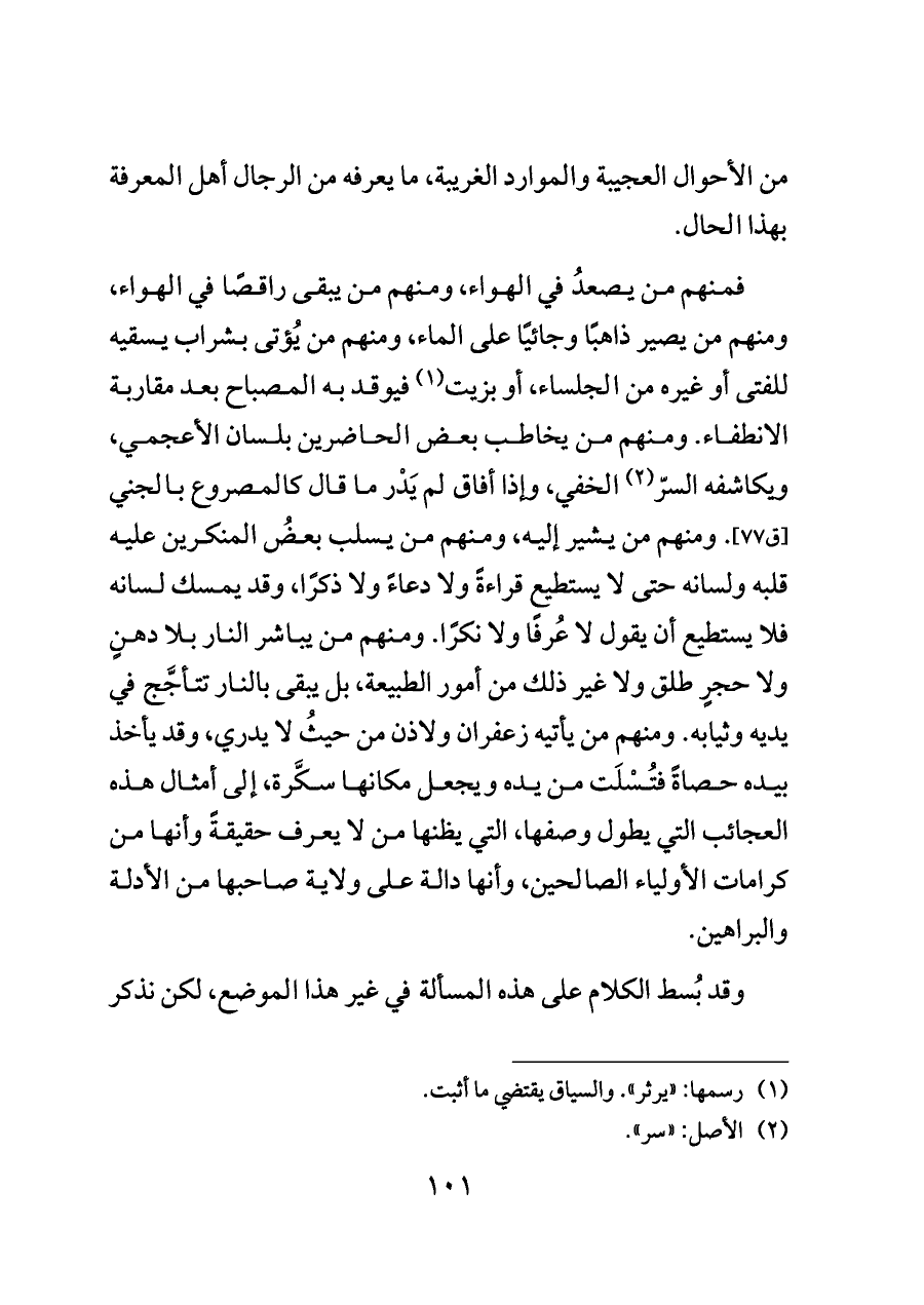 فمنهم من يصعدُ في الهواء، ومنهم من يبقى راقصًا في الهواء، ومنهم من يصير ذاهبًا وجائيًا على الماء، ومنهم من يُؤتى بشراب يسقيه للفتى أو غيره من الجلساء، أو بزيت (¬١) فيوقد به المصباح بعد مقاربة الانطفاء. ومنهم من يخاطب بعض الحاضرين بلسان الأعجمي، ويكاشفه السرّ (¬٢) الخفي، وإذا أفاق لم يَدْر ما قال كالمصروع بالجني [ق ٧٧]. ومنهم من يشير إليه، ومنهم من يسلب بعضُ المنكرين عليه قلبه ولسانه حتى لا يستطيع قراءةً ولا دعاءً ولا ذكرًا، وقد يمسك لسانه فلا يستطيع أن يقول لا عُرفًا ولا نكرًا. ومنهم من يباشر النار بلا دهنٍ ولا حجرٍ طلق ولا غير ذلك من أمور الطبيعة، بل يبقى بالنار تتأجَّج في يديه وثيابه. ومنهم من يأتيه زعفران ولاذن من حيثُ لا يدري، وقد يأخذ بيده حصاةً فتُسْلَت من يده ويجعل مكانها سكَّرة، إلى أمثال هذه العجائب التي يطول وصفها، التي يظنها من لا يعرف حقيقةً وأنها من كرامات الأولياء الصالحين، وأنها دالة على ولاية صاحبها من الأدلة والبراهين.