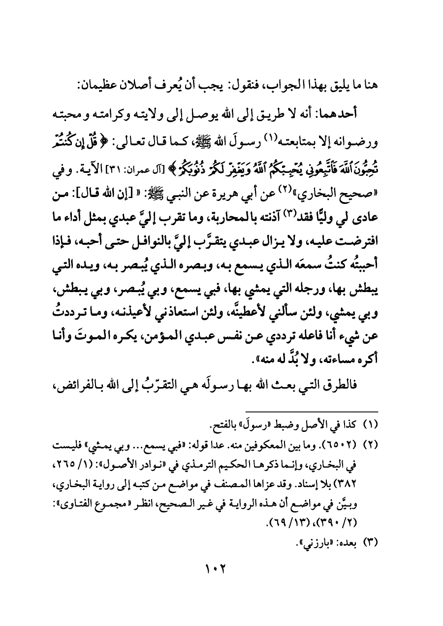 أحدهما: أنه لا طريق إلى الله يوصل إلى ولايته وكرامته ومحبته ورضوانه إلا بمتابعته (¬١) رسولَ الله - صلى الله عليه وسلم -، كما قال تعالى: {قُلْ إِنْ كُنْتُمْ تُحِبُّونَ اللَّهَ فَاتَّبِعُونِي يُحْبِبْكُمُ اللَّهُ وَيَغْفِرْ لَكُمْ ذُنُوبَكُمْ} [آل عمران: ٣١] الآية. وفي «صحيح البخاري» (¬٢) عن أبي هريرة عن النبي - صلى الله عليه وسلم -: «[إن الله قال]: من عادى لي وليًّا فقد (¬٣) آذنته بالمحاربة، وما تقرب إليَّ عبدي بمثل أداء ما افترضت عليه، ولا يزال عبدي يتقرَّب إليَّ بالنوافل حتى أحبه، فإذا أحببتُه كنتُ سمعَه الذي يسمع به، وبصره الذي يُبصر به، ويده التي يبطش بها، ورجله التي يمشي بها، فبي يسمع، وبي يُبصر، وبي يبطش، وبي يمشي، ولئن سألني لأعطينَّه، ولئن استعاذني لأعيذنه، وما ترددتُ عن شيء أنا فاعله ترددي عن نفس عبدي المؤمن، يكره الموتَ وأنا أكره مساءته، ولا بُدَّ له منه».