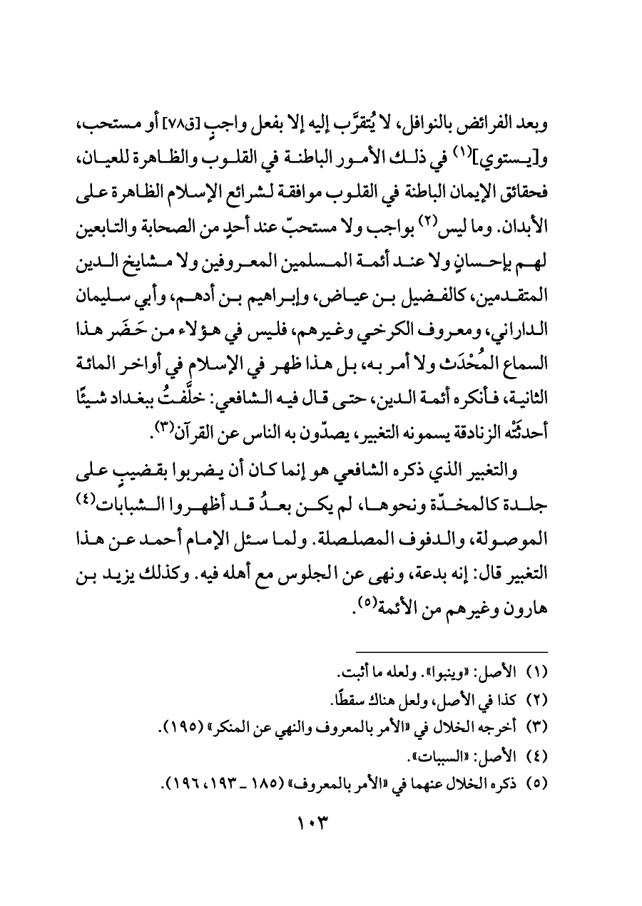 وبعد الفرائض بالنوافل، لا يُتقرَّب إليه إلا بفعل واجبٍ [ق ٧٨] أو مستحب، و [يستوي] (¬١) في ذلك الأمور الباطنة في القلوب والظاهرة للعيان، فحقائق الإيمان الباطنة في القلوب موافقة لشرائع الإسلام الظاهرة على الأبدان. وما ليس (¬٢) بواجب ولا مستحبّ عند أحدٍ من الصحابة والتابعين لهم بإحسانٍ ولا عند أئمة المسلمين المعروفين ولا مشايخ الدين المتقدمين، كالفضيل بن عياض، وإبراهيم بن أدهم، وأبي سليمان الداراني، ومعروف الكرخي وغيرهم، فليس في هؤلاء من حَضَر هذا السماع المُحْدَث ولا أمر به، بل هذا ظهر في الإسلام في أواخر المائة الثانية، فأنكره أئمة الدين، حتى قال فيه الشافعي: خلَّفتُ ببغداد شيئًا أحدثَتْه الزنادقة يسمونه التغبير، يصدّون به الناس عن القرآن (¬٣).
