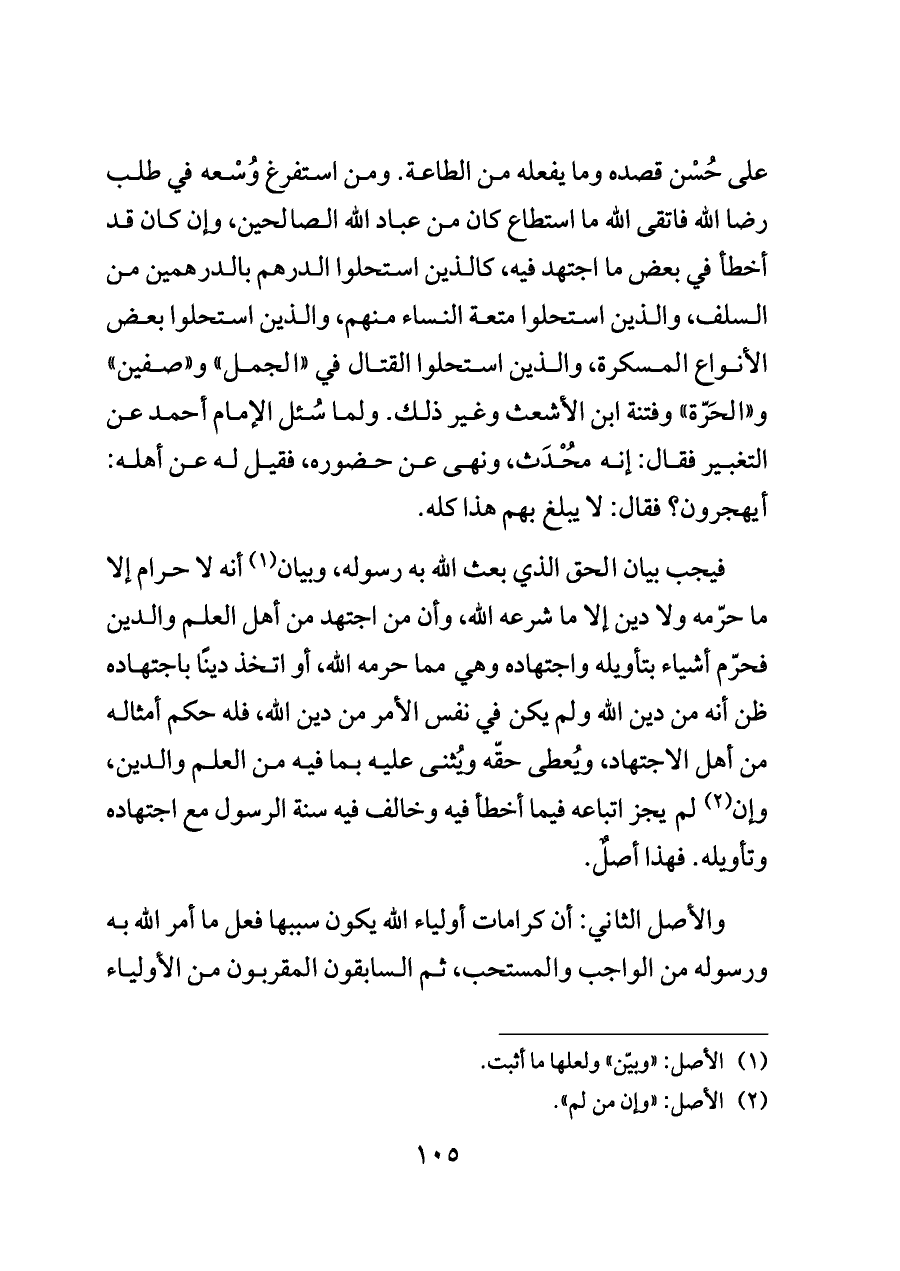 على حُسْن قصده وما يفعله من الطاعة. ومن استفرغ وُسْعه في طلب رضا الله فاتقى الله ما استطاع كان من عباد الله الصالحين، وإن كان قد أخطأ في بعض ما اجتهد فيه، كالذين استحلوا الدرهم بالدرهمين من السلف، والذين استحلوا متعة النساء منهم، والذين استحلوا بعض الأنواع المسكرة، والذين استحلوا القتال في «الجمل» و «صفين» و «الحَرّة» وفتنة ابن الأشعث وغير ذلك. ولما سُئل الإمام أحمد عن التغبير فقال: إنه مُحْدَث، ونهى عن حضوره، فقيل له عن أهله: أيهجرون؟ فقال: لا يبلغ بهم هذا كله.