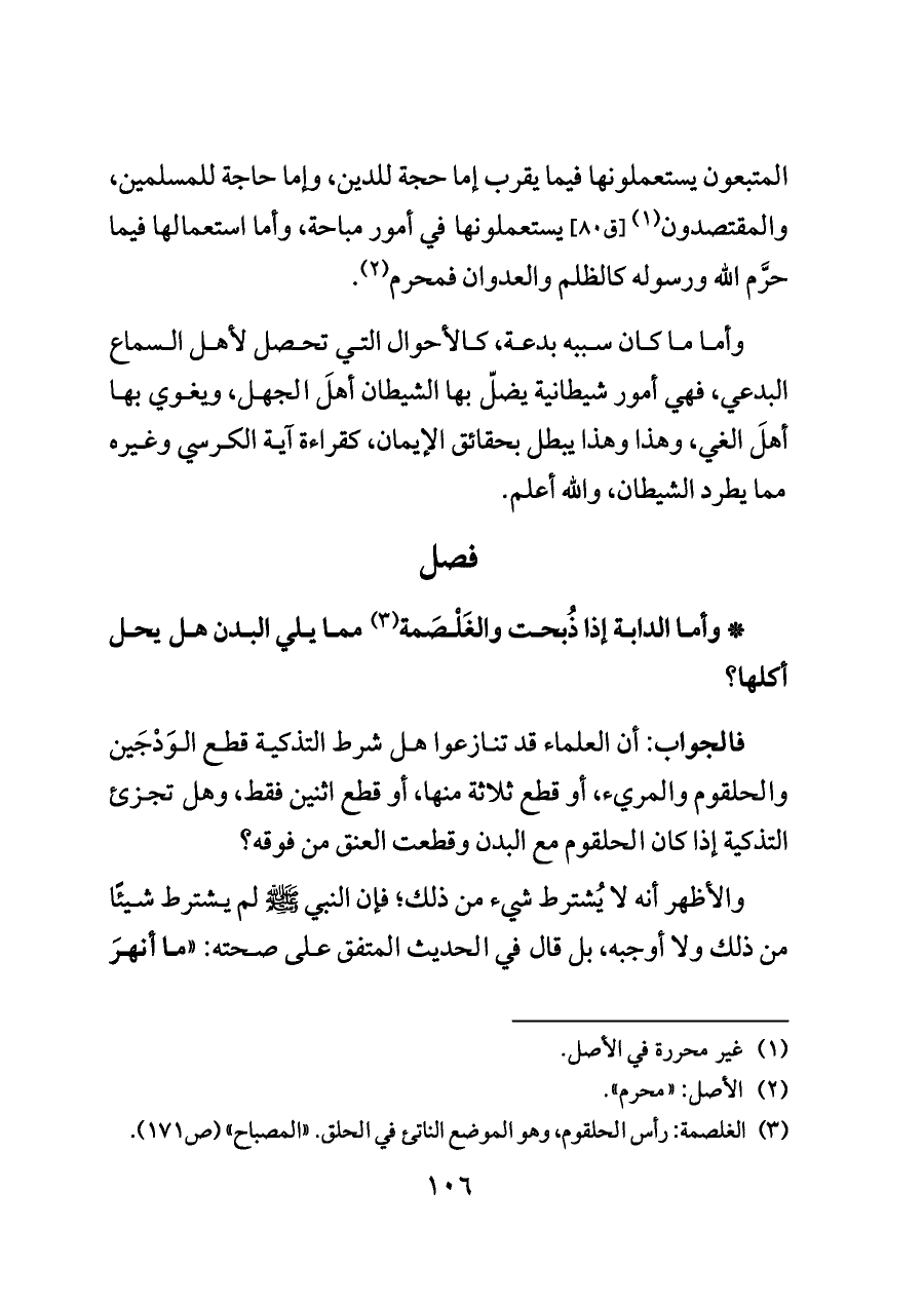فالجواب: أن العلماء قد تنازعوا هل شرط التذكية قطع الوَدْجَين والحلقوم والمريء، أو قطع ثلاثة منها، أو قطع اثنين فقط، وهل تجزئ التذكية إذا كان الحلقوم مع البدن وقطعت العنق من فوقه؟