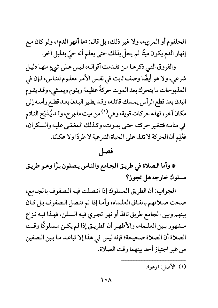 والفروق التي ذكرها من تقدمت أقواله، ليس على شيءٍ منها دليل شرعي، ولا هو أيضًا وصف ثابت في نفس الأمر معلوم للناس، فإن في المذبوحات ما يتحرك بعد الموت حركةً عظيمة ويقوم ويمشي، وقد يقوم البدن بعد قطع الرأس يمسك قاتله، وقد يطير البدن بعد قطع رأسه إلى مكان آخر، فهذه حركات قوية، وهي (¬١) من ميت مذبوح، وقد يُذبَح النائم في منامه فتتغير حركته حتى يموت، وكذلك المغمَى عليه والسكران، فعُلِم أن الحركة لا تدل على الحياة الشرعية لا طردًا ولا عكسًا.