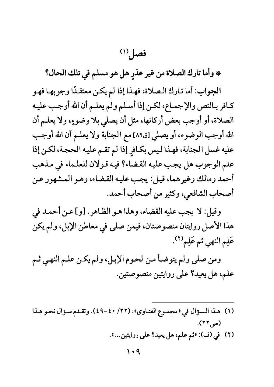 الجواب: أما تارك الصلاة، فهذا إذا لم يكن معتقدًا وجوبها فهو كافر بالنص والإجماع، لكن إذا أسلم ولم يعلم أن الله أوجب عليه الصلاة، أو أوجب بعض أركانها، مثل أن يصلي بلا وضوءٍ، ولا يعلم أن الله أوجب الوضوء، أو يصلي [ق ٨٢] مع الجنابة ولا يعلم أن الله أوجب عليه غسل الجنابة، فهذا ليس بكافرٍ إذا لم تقم عليه الحجة، لكن إذا علم الوجوب هل يجب عليه القضاء؟ فيه قولان للعلماء في مذهب أحمد ومالك وغيرهما، قيل: يجب عليه القضاء، وهو المشهور عن أصحاب الشافعي، وكثير من أصحاب أحمد.
