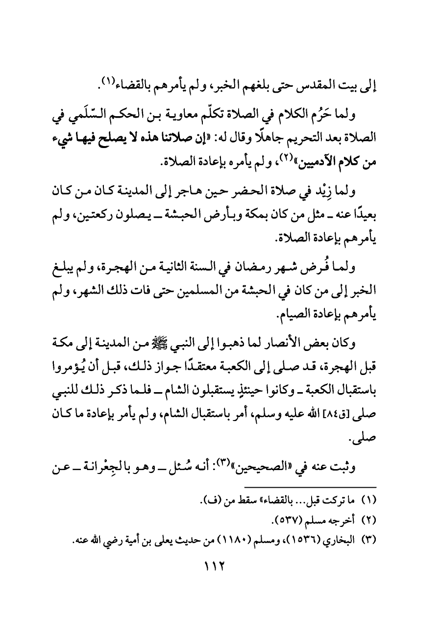 ولما زِيْد في صلاة الحضر حين هاجر إلى المدينة كان من كان بعيدًا عنه ــ مثل من كان بمكة وبأرض الحبشة ــ يصلون ركعتين، ولم يأمرهم بإعادة الصلاة.