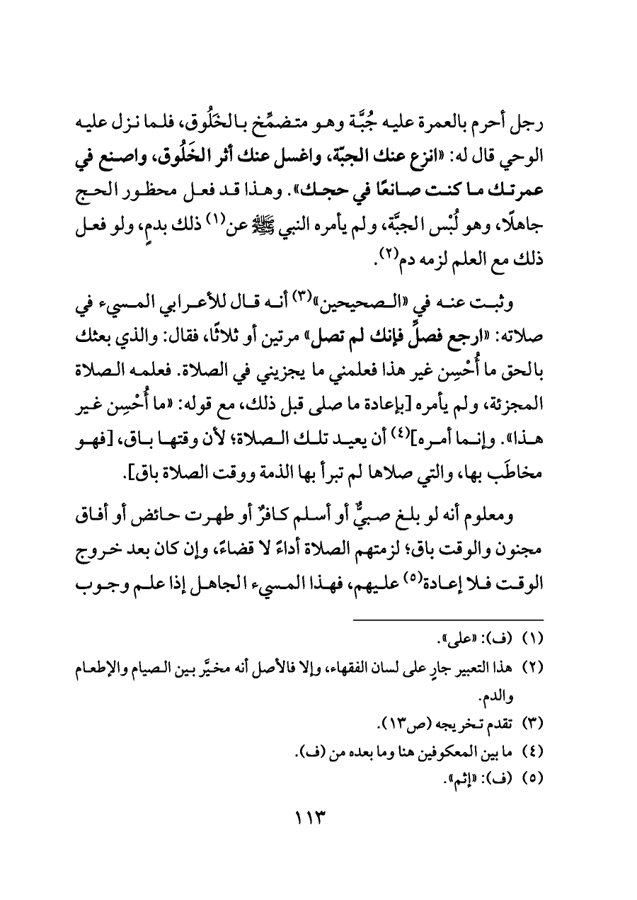 وثبت عنه في «الصحيحين» (¬٣) أنه قال للأعرابي المسيء في صلاته: «ارجع فصلِّ فإنك لم تصل» مرتين أو ثلاثًا، فقال: والذي بعثك بالحق ما أُحْسِن غير هذا فعلمني ما يجزيني في الصلاة. فعلمه الصلاة المجزئة، ولم يأمره [بإعادة ما صلى قبل ذلك، مع قوله: «ما أُحْسِن غير هذا». وإنما أمره] (¬٤) أن يعيد تلك الصلاة؛ لأن وقتها باق، [فهو مخاطَب بها، والتي صلاها لم تبرأ بها الذمة ووقت الصلاة باق].