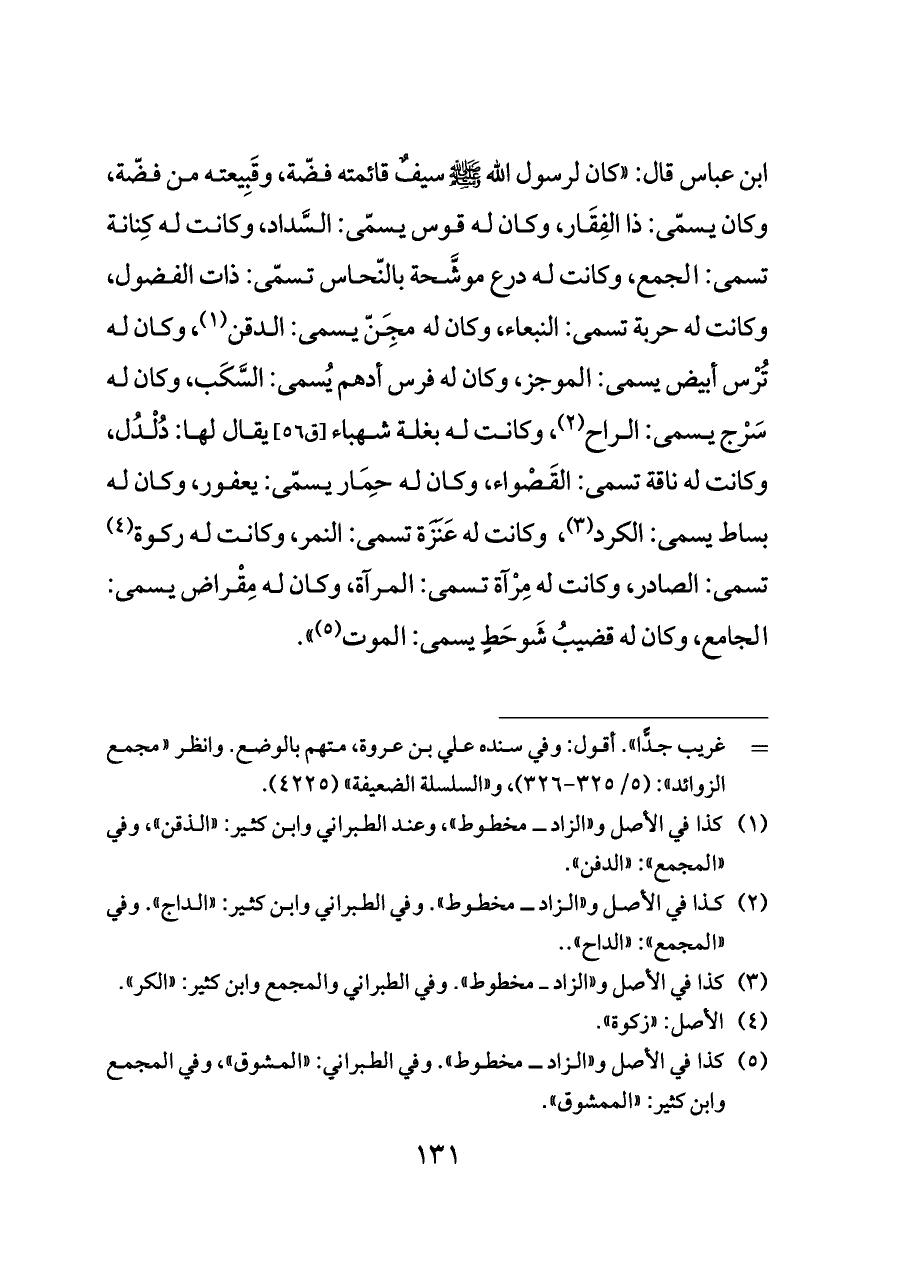 ابن عباس قال: "كان لرسول الله - صلى الله عليه وسلم - سيفٌ قائمته فضّة، وقَبِيعته من فضّة، وكان يسمّى: ذا الفِقَار، وكان له قوس يسمّى: السَّداد، وكانت له كِنانة تسمى: الجمع، وكانت له درع موشَّحة بالنّحاس تسمّى: ذات الفضول، وكانت له حربة تسمى: النبعاء، وكان له مِجَنّ يسمى: الدقن (¬١)، وكان له تُرْس أبيض يسمى: الموجز، وكان له فرس أدهم يُسمى: السَّكَب، وكان له سَرْج يسمى: الراح (¬٢)، وكانت له بغلة شهباء [ق ٥٦] يقال لها: دُلْدُل، وكانت له ناقة تسمى: القَصْواء، وكان له حِمَار يسمّى: يعفور، وكان له بساط يسمى: الكرد (¬٣)، وكانت له عَنَزَة تسمى: النمر، وكانت له ركوة (¬٤) تسمى: الصادر، وكانت له مِرْآة تسمى: المرآة، وكان له مِقْراض يسمى: الجامع، وكان له قضيبُ شَوحَطٍ يسمى: الموت (¬٥) ".