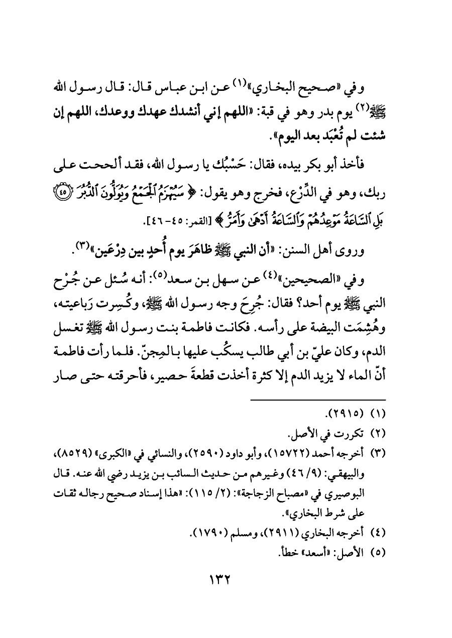 فأخذ أبو بكر بيده، فقال: حَسْبُك يا رسول الله، فقد ألححت على ربك، وهو في الدِّرْع، فخرج وهو يقول: {سَيُهْزَمُ الْجَمْعُ وَيُوَلُّونَ الدُّبُرَ (٤٥) بَلِ السَّاعَةُ مَوْعِدُهُمْ وَالسَّاعَةُ أَدْهَى وَأَمَرُّ} [القمر: ٤٥ - ٤٦].