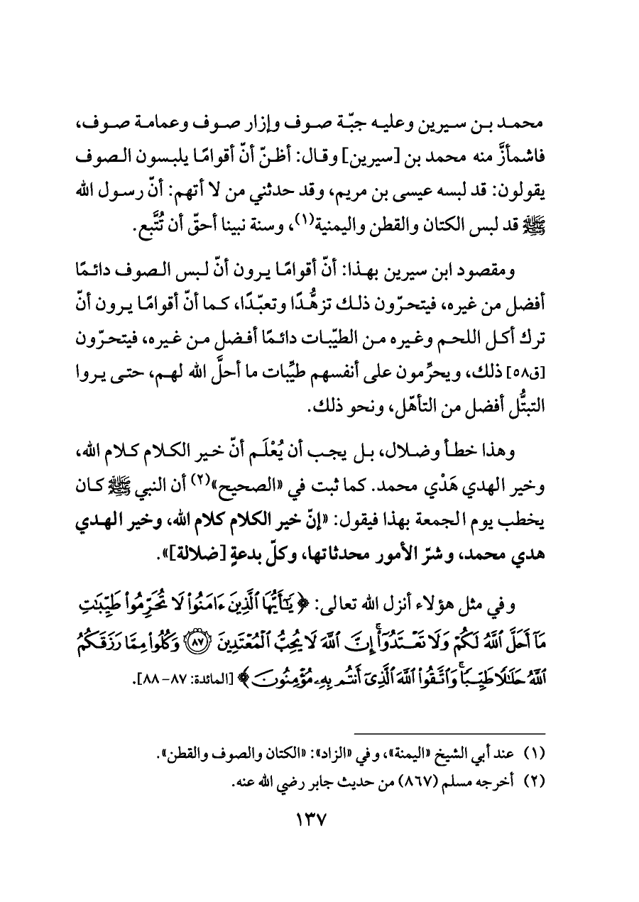 ومقصود ابن سيرين بهذا: أنّ أقوامًا يرون أنّ لبس الصوف دائمًا أفضل من غيره، فيتحرّون ذلك تزهُّدًا وتعبّدًا، كما أنّ أقوامًا يرون أنّ ترك أكل اللحم وغيره من الطيّبات دائمًا أفضل من غيره، فيتحرّون [ق ٥٨] ذلك، ويحرِّمون على أنفسهم طيِّبات ما أحلَّ الله لهم، حتى يروا التبتُّل أفضل من التأهّل، ونحو ذلك.